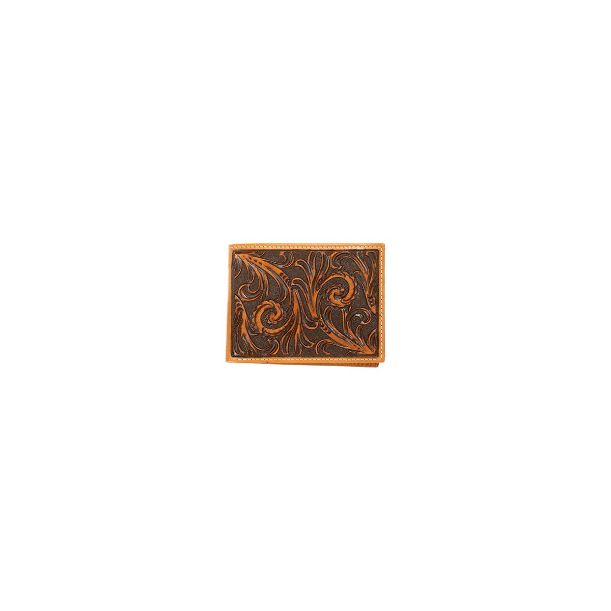 Description: This Nocona bifold wallet by M&F Western Products is genuine leather with an embossed scrolling on the body. Multiple card slots, cash slot and an ID window on the inside.