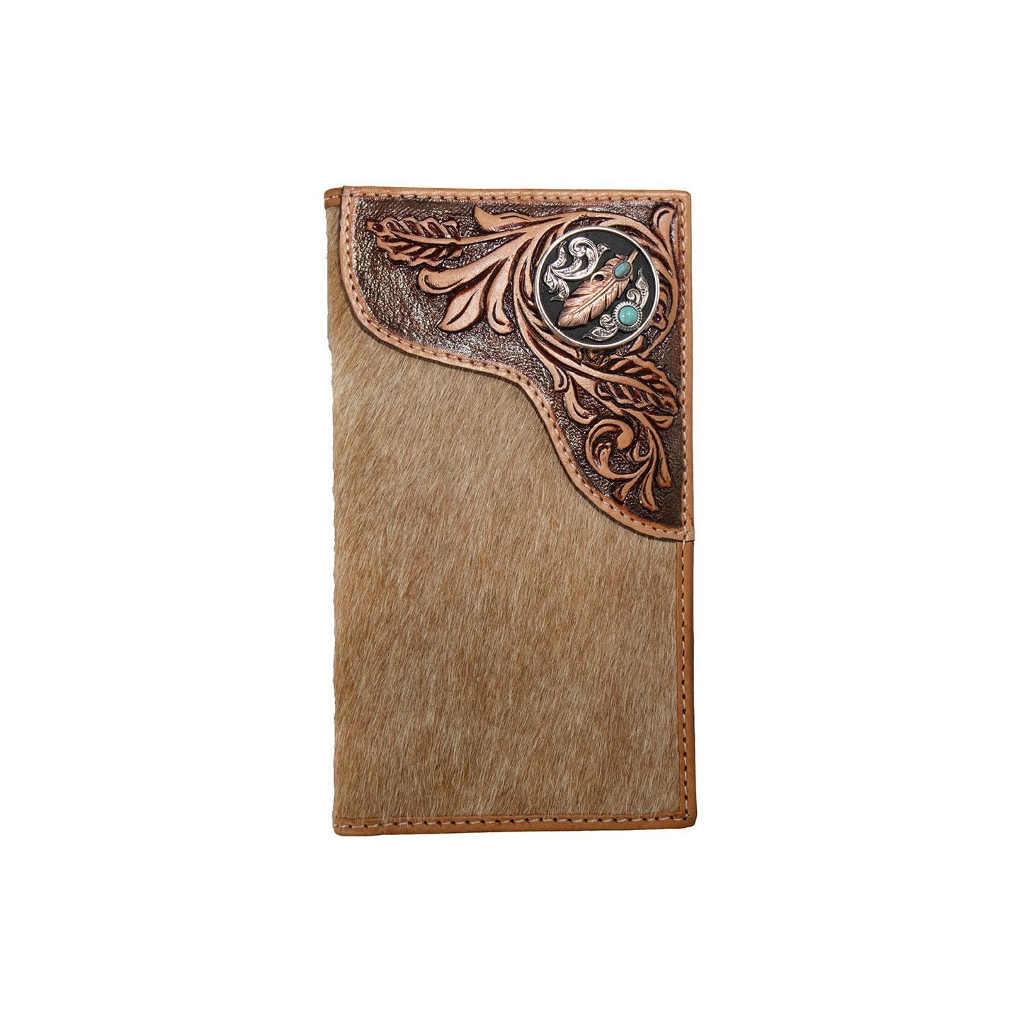 Description: This Nocona rodeo wallet by M&F Western Products is genuine leather. It features a light brown brindle calf hair body with a tooled leather corner overlay and feather concho. Multiple card and cash slots, checkbook slot and ID window on the inside.