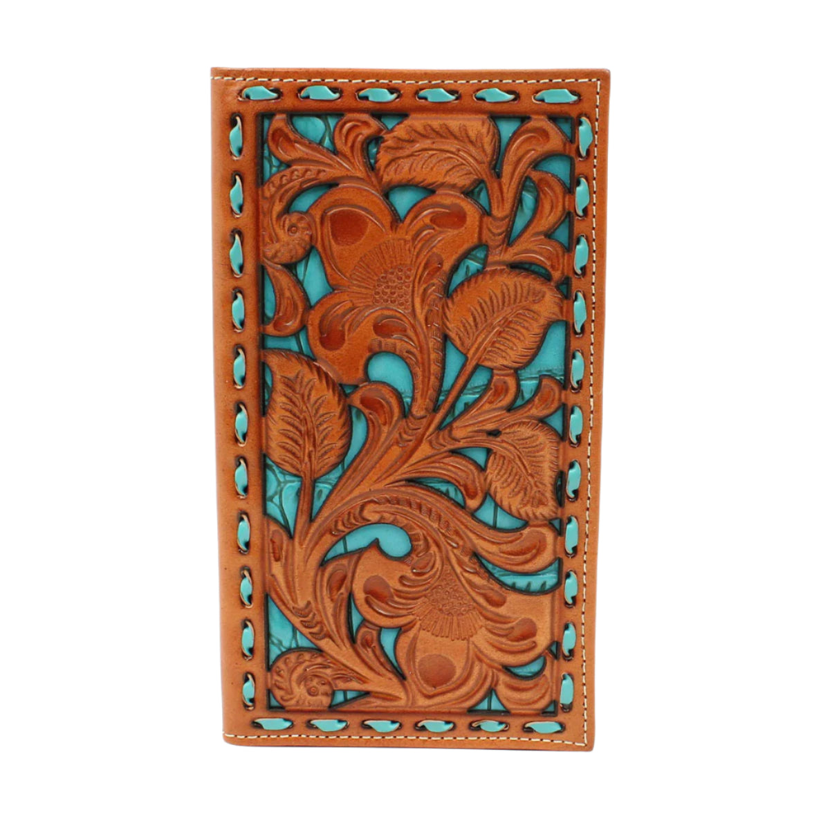 This Nocona leather rodeo wallet by M&F Western Products features a tan floral embossed piercing with a turquoise underlay. The edges have a matching turquoise buck lacing, and white contrast stitching. Inside features a clear ID slot, credit card slots, removable photo slip, checkbook and money slot. This quality wallet will keep your money safe as you carry it in style.