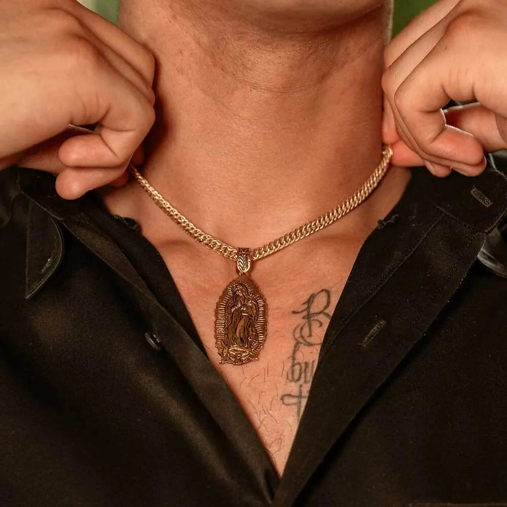 Carry this meaningful symbol with you where ever you go with the Lady of Guadalupe Necklace. The pendant of the design is a sculpted Lady of Guadalupe figure in a brilliant gold finish. A dark antiquing on the figure brings out the details and gives the design a statement making look. A gold tone bail has detailed etchings to add a bold look. A 24 inch gold tone wheat chain finishes the design.
