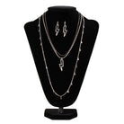 Beautifully paired Blazin Roxx ladies earrings and necklace set by M&F Western Products. The necklace has 3 multi length chains, ana lightning bolt pendants on one of the chains, and earrings.