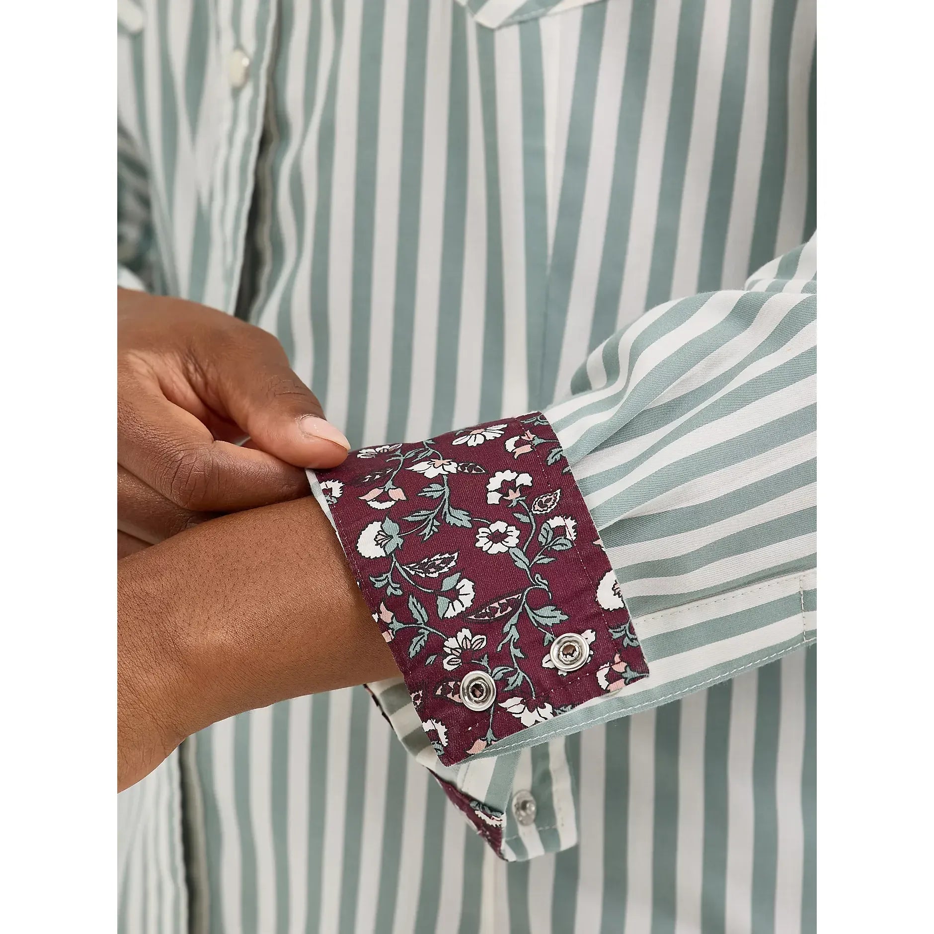 A cowgirl can never have too many collared shirts for competition and daily life. Our Women's Wrangler Retro® All-Occasion Western Snap Dress Shirt is crafted a lightweight cotton and recycled materials blend that will keep you comfortable in everything you do. It comes with pointed yokes, pearl snaps, two chest pockets with the signature "W" stitching, and a contrast print at the cuffs.