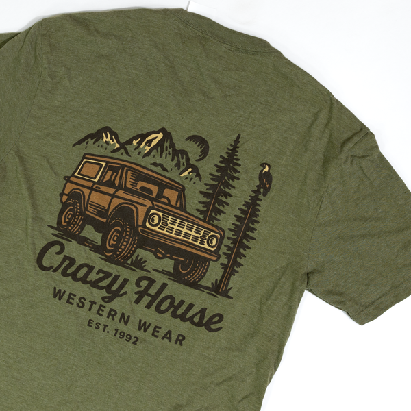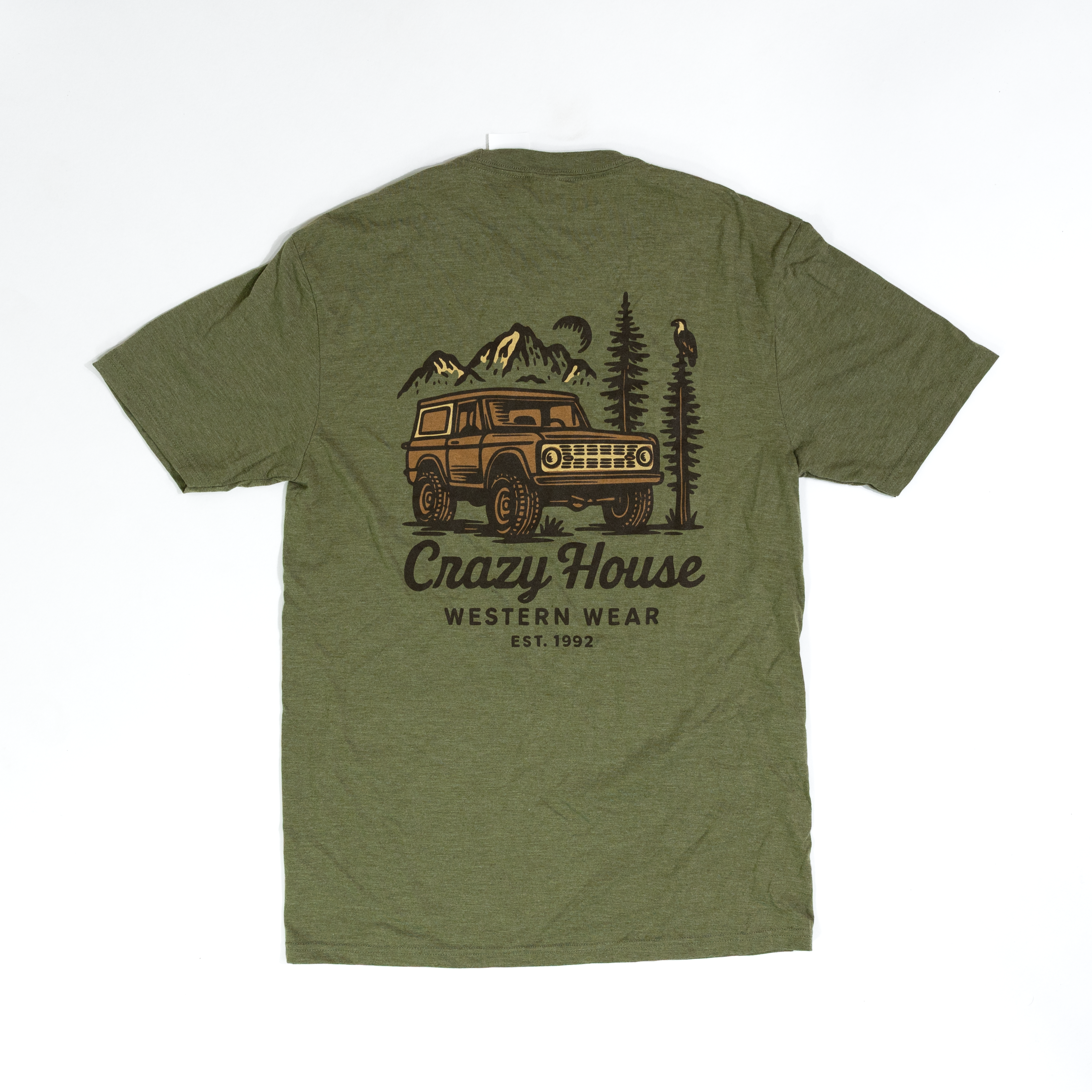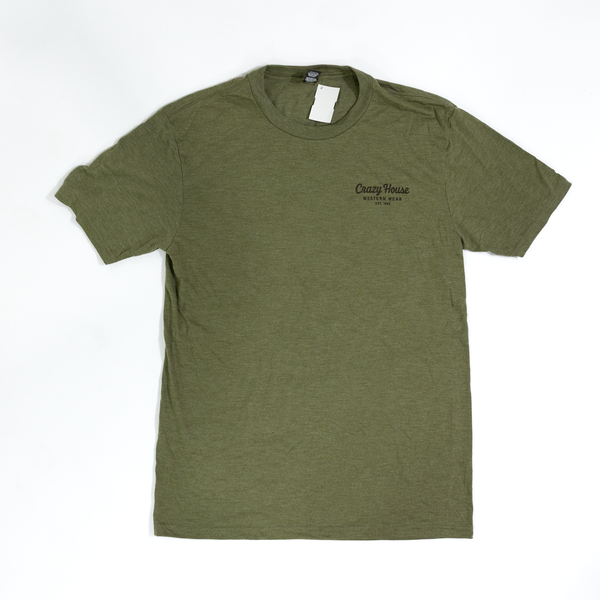 Unisex Crazy House Green Specialty T-shirt with Printed Design on the Back DM130-MILGRNFRS-52014