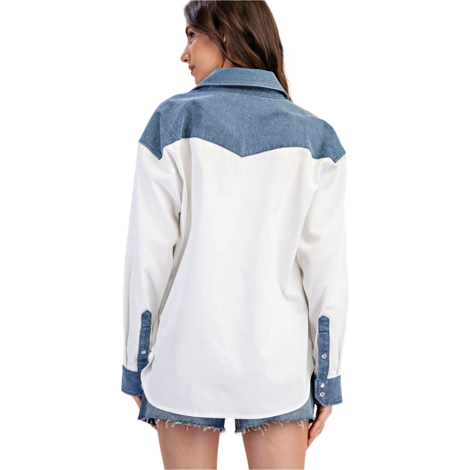 This long sleeve button down shirt showcases a crisp white body contrasted by denim panels on the yoke, chest pockets, cuffs, and collar, with snap closures and western inspired stitching for a bold yet classic statement piece. White denim styled with PK14020 Model is 5'9" and is wearing a small.