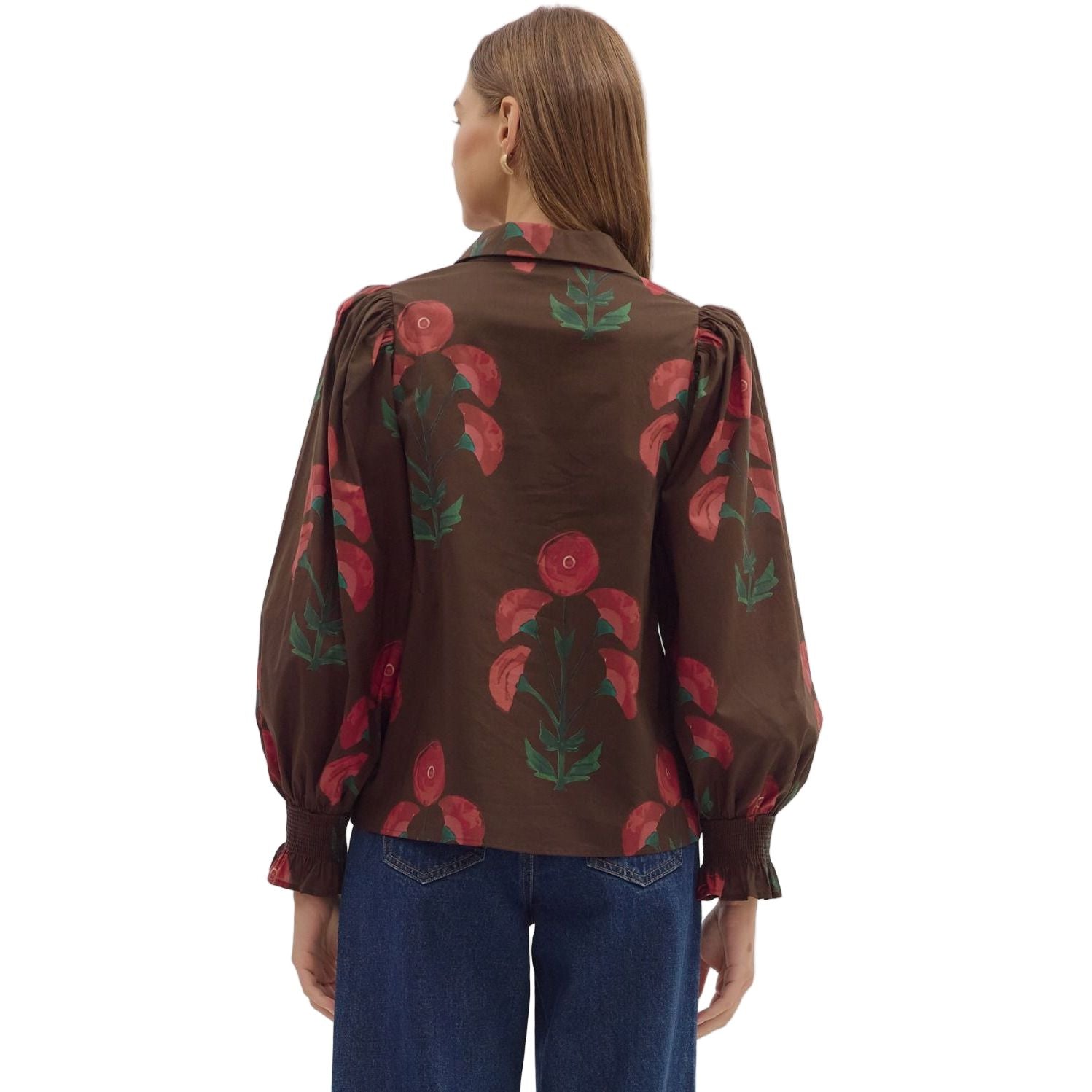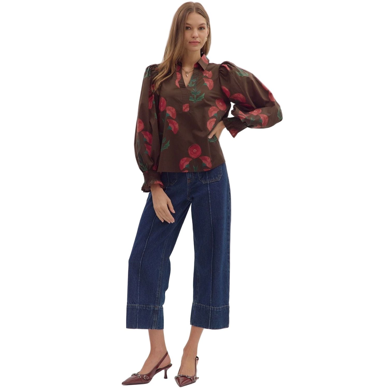 Women's Entro Brown Floral Print Long Puff Sleeve Top T28839