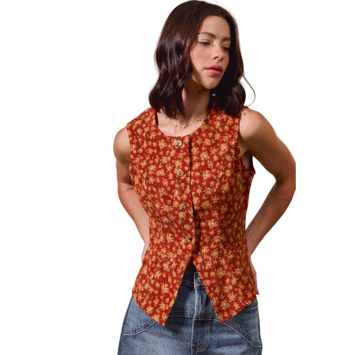 Women's Slim Fit Button Front Floral Corduroy Vest Top ST2710F-05
