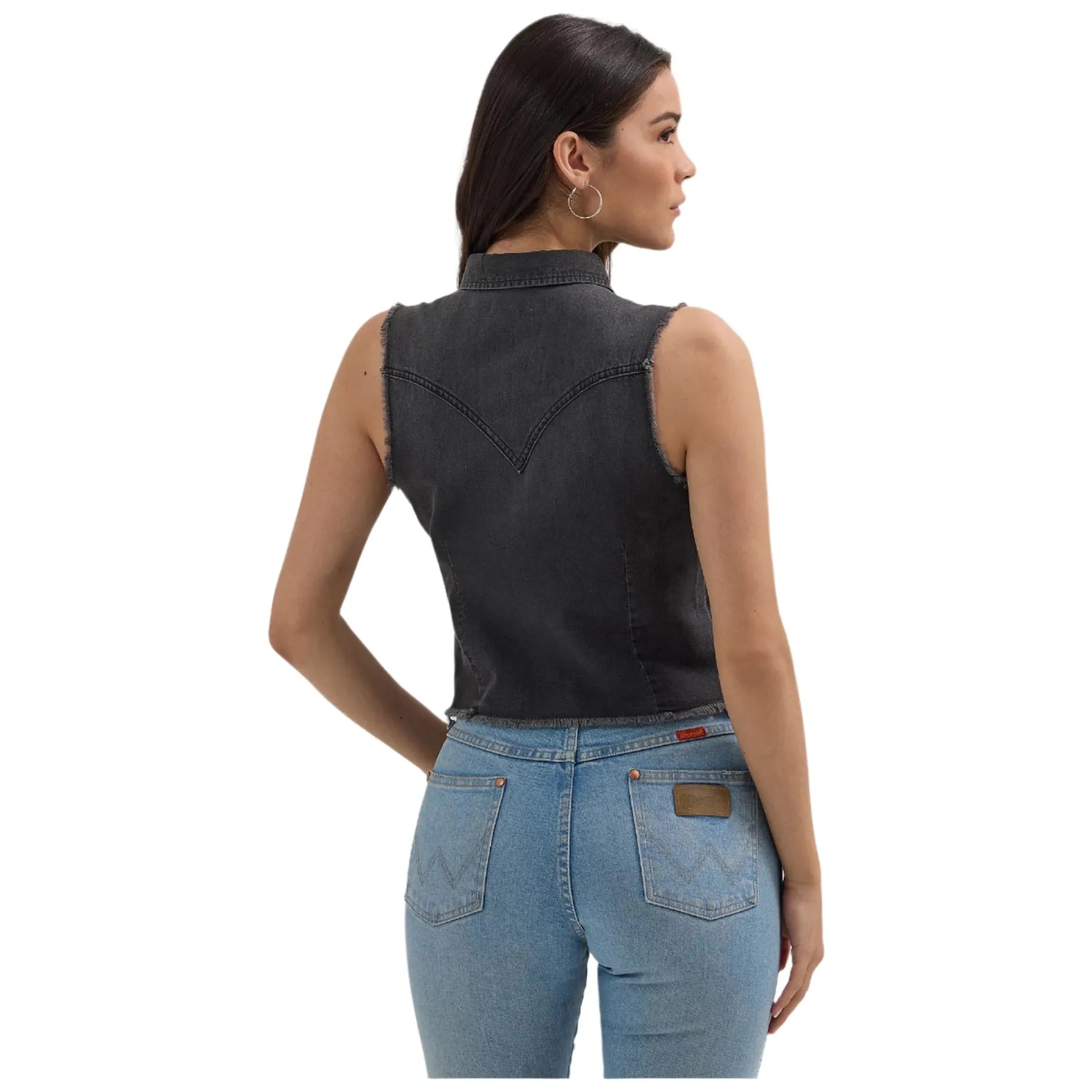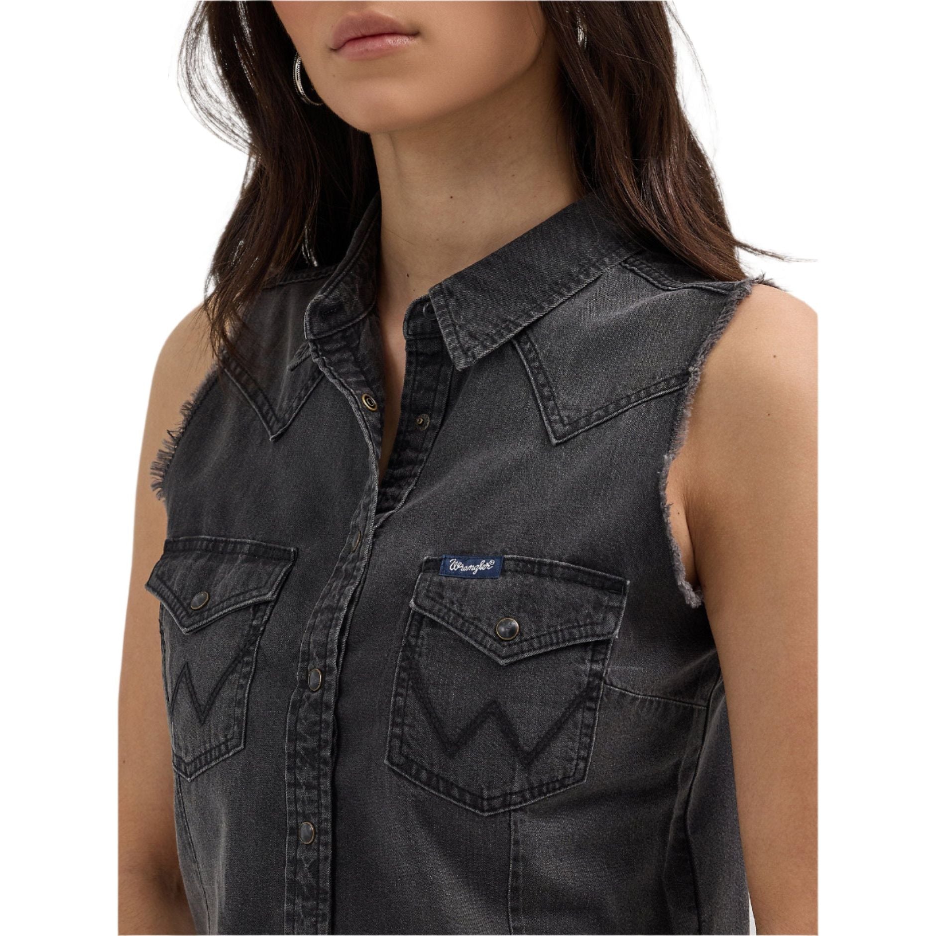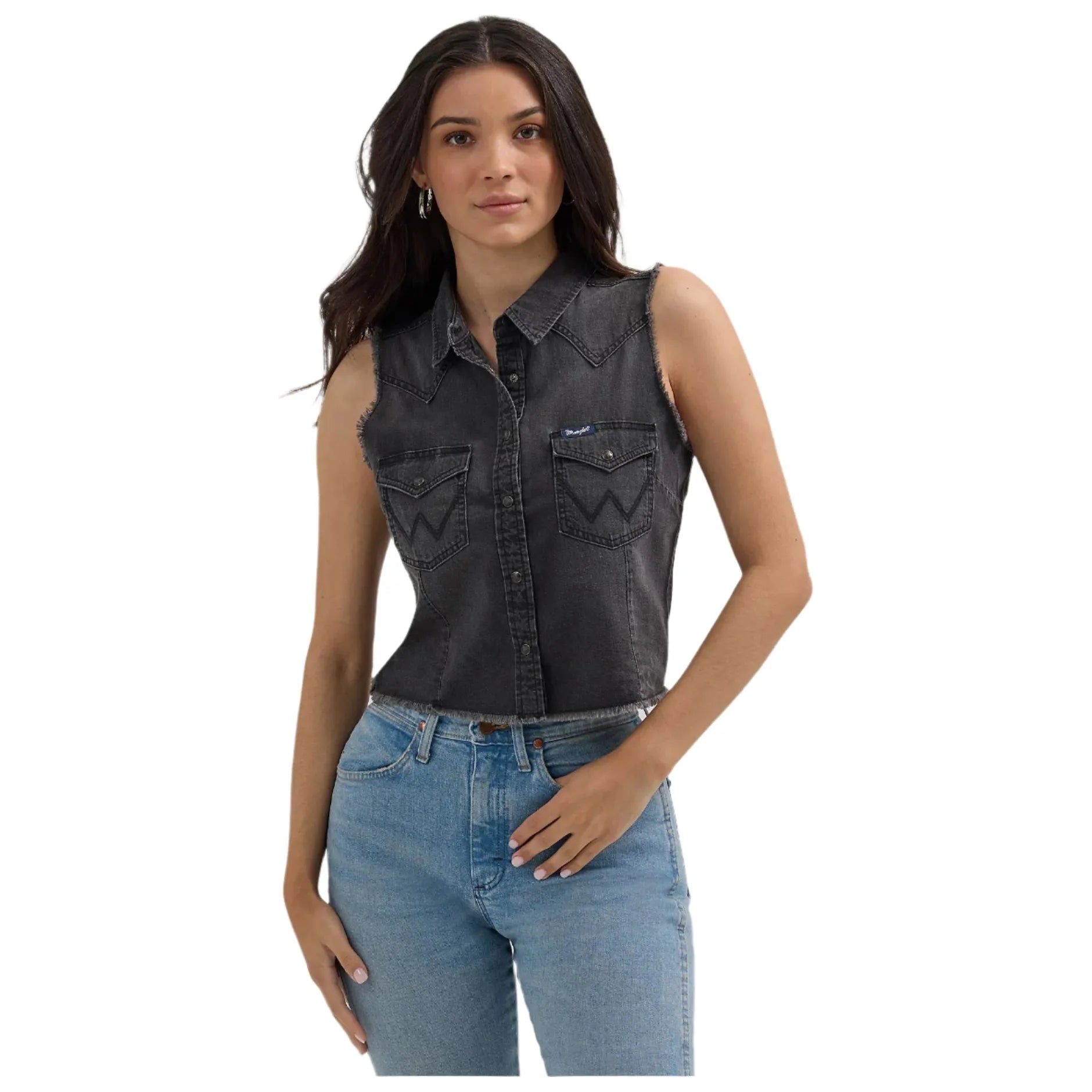 Taking a few cues from our archives, the women's Wrangler Retro® sleeveless frayed denim crop shirt comes with all the iconic details you know and love. It features pointed yokes, two chest pockets with pointed flaps, the "W" embroidery, and pearl snaps. This cropped denim shirt is crafted for comfort from sunup to sundown. Plus, it comes with fraying at the sleeves and hem for a worn-in look without any break-in time required.