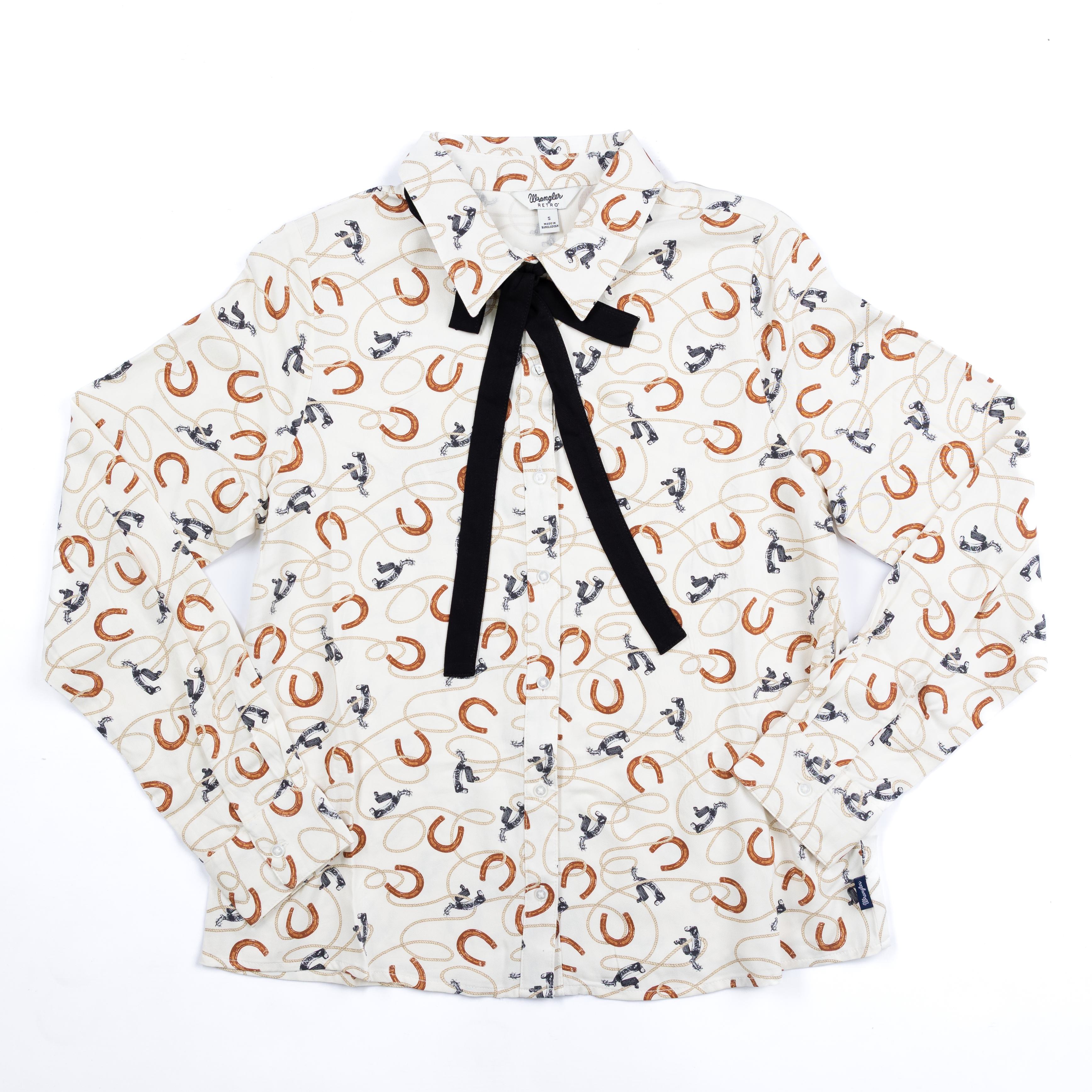 Elevate your Western look with our Women's Tie Neck Blouse. It’s made of a soft and breathable fabric you can wear from one season to the next. This classic collared shirt really ups the ante with ties at the neck you can wear in a ladylike bow or leave long and loose to match the mood. Plus, it’s finished with a cowgirl-friendly print full of horseshoes, rope, and spurs.