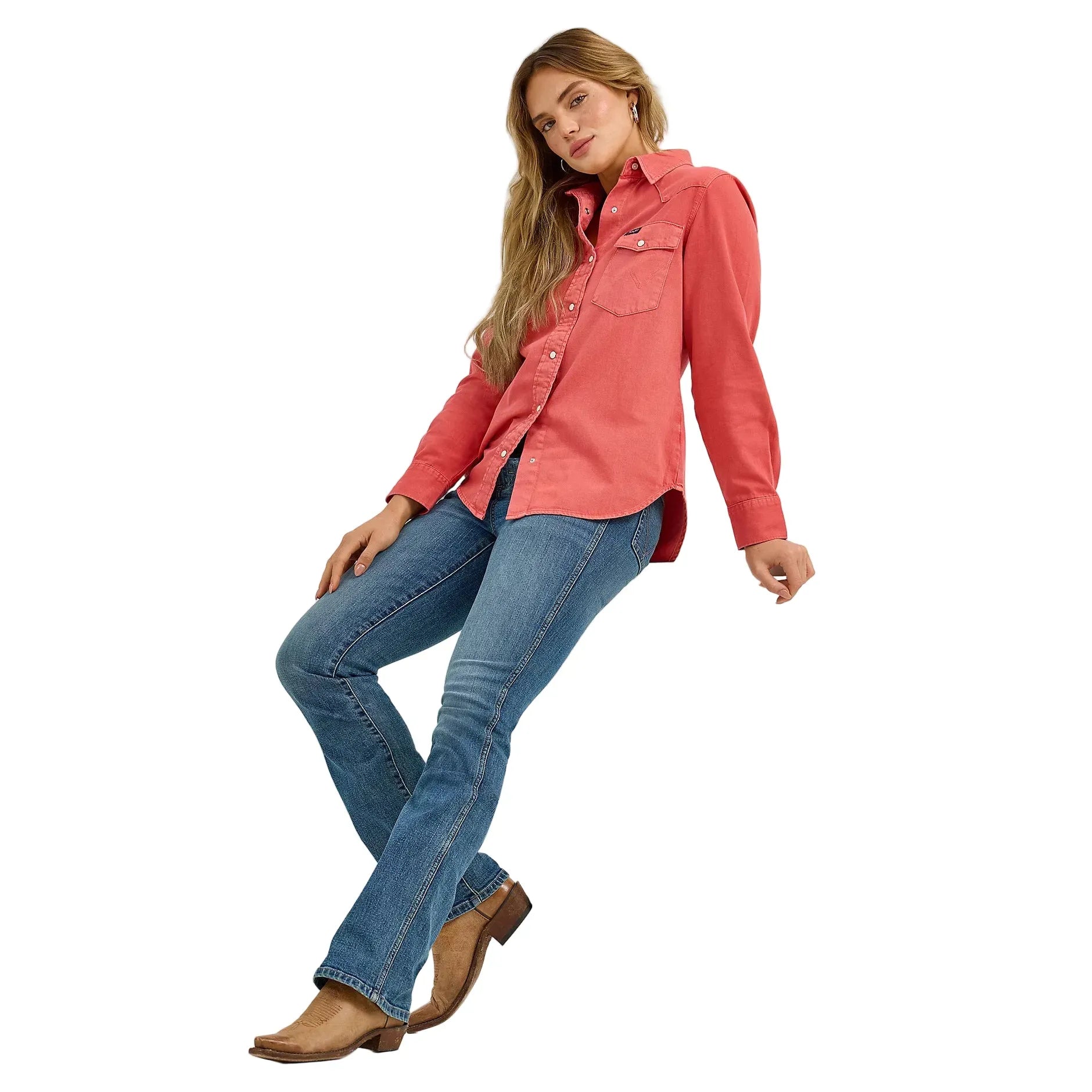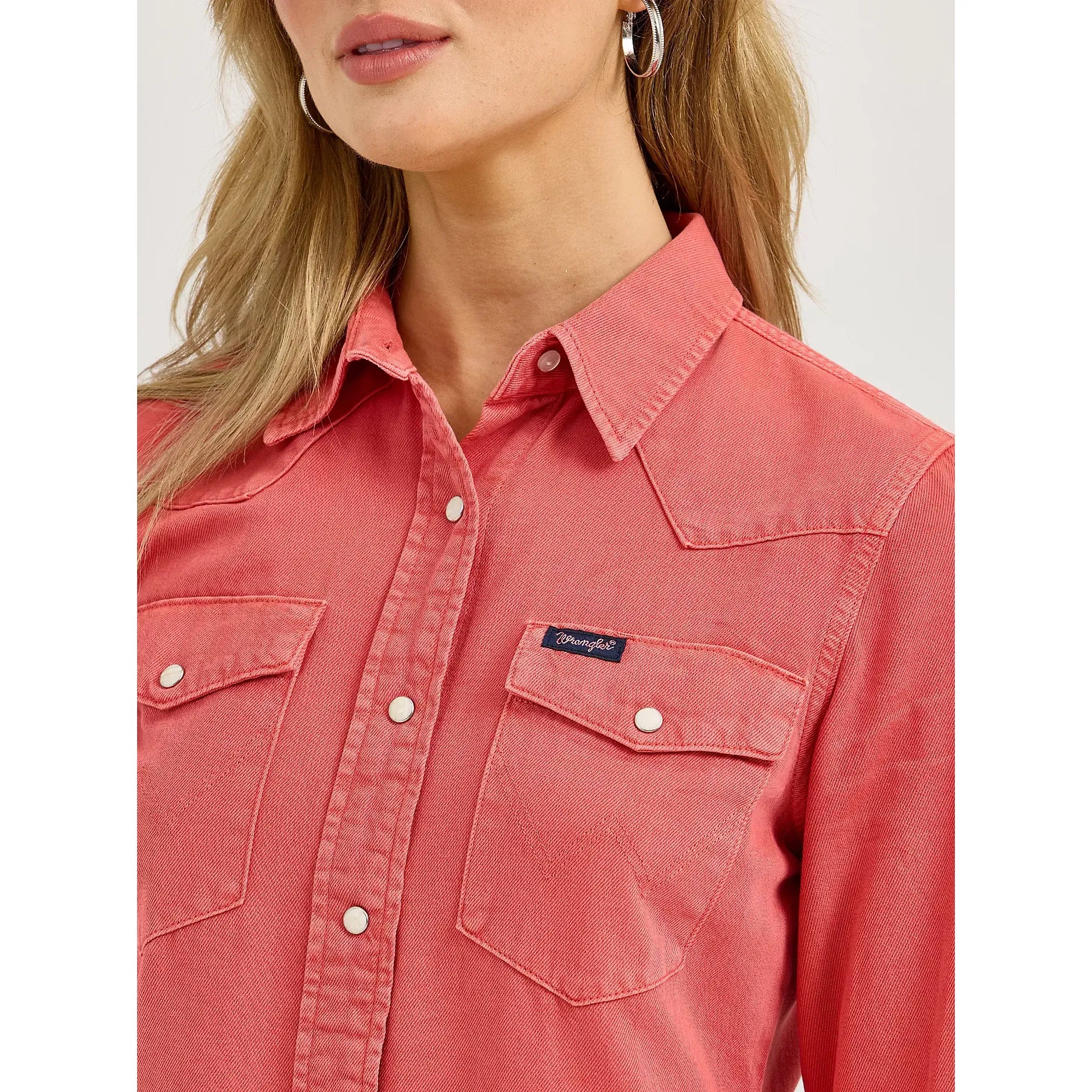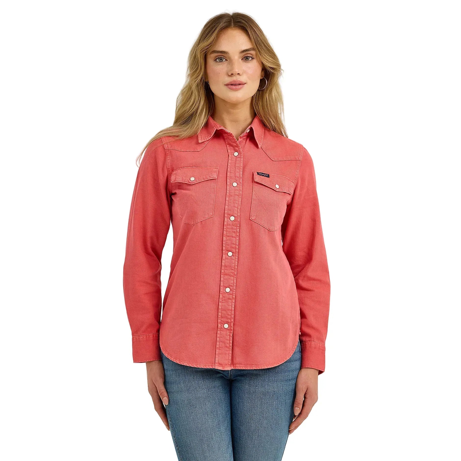 A cowgirl can never have too many snap shirts. Our Women’s Wrangler Retro® Color wash Slim Western Snap Shirt will add a bold hue to your rotation. It’s crafted from 100% cotton for easy care and nonstop comfort. Like a found favorite you didn’t have to hunt down, it comes with a flattering slim fit, one-point yokes from front to back, pearl snaps, and chest pockets with the signature ‘W’ stitching. Plus, the curved hem can be tucked in or left untucked for versatility.