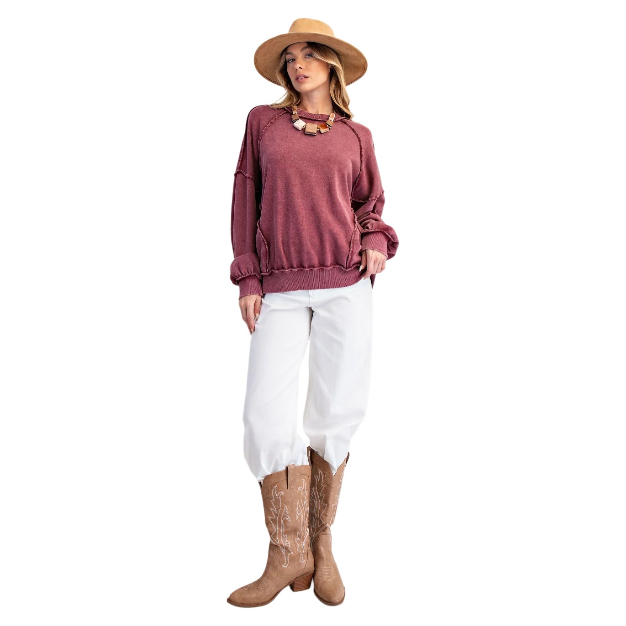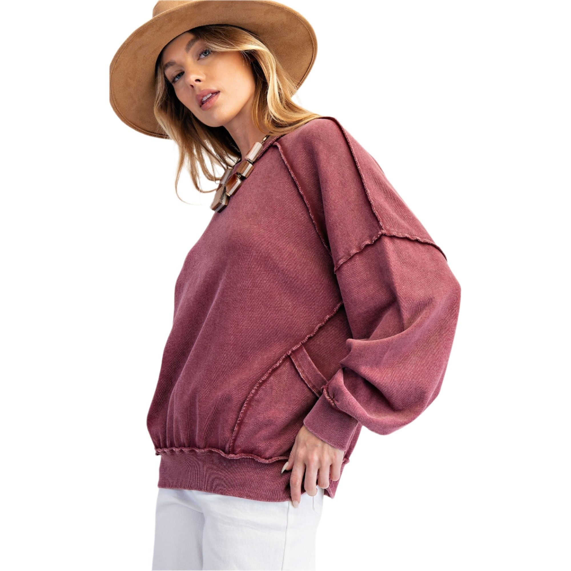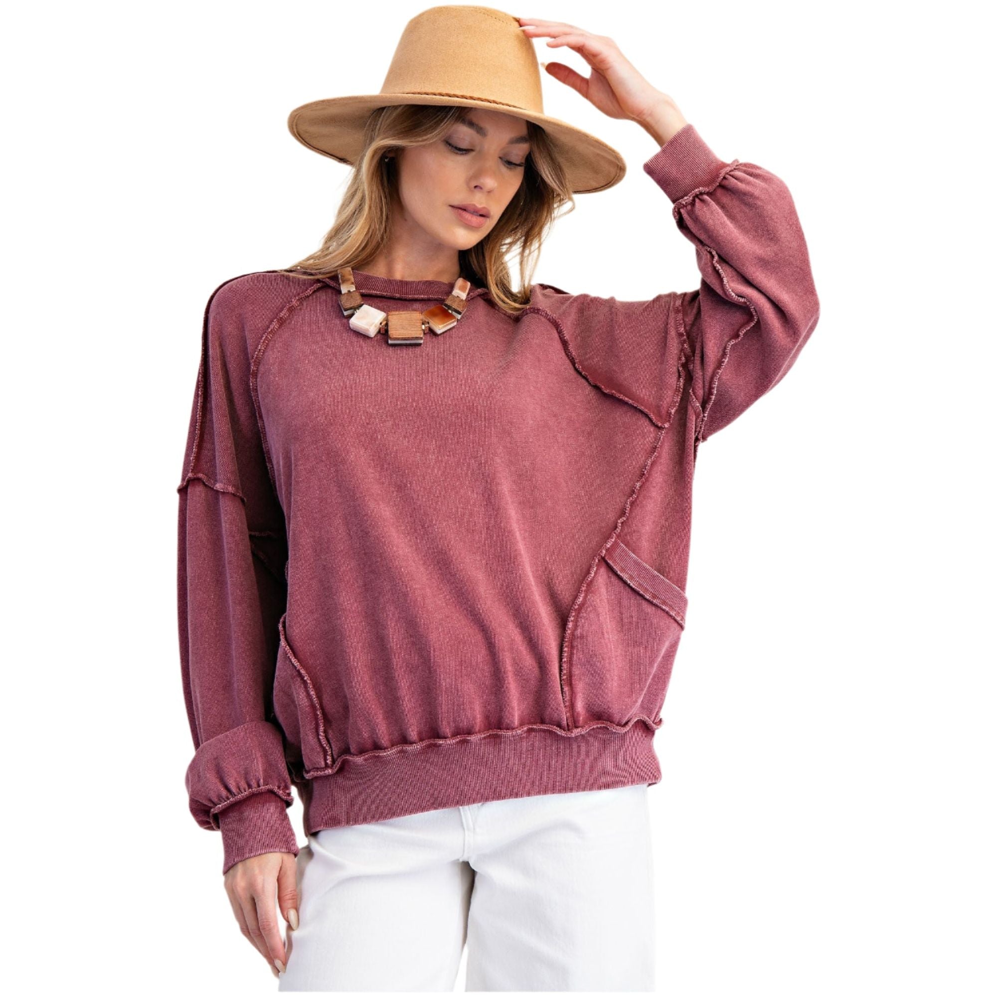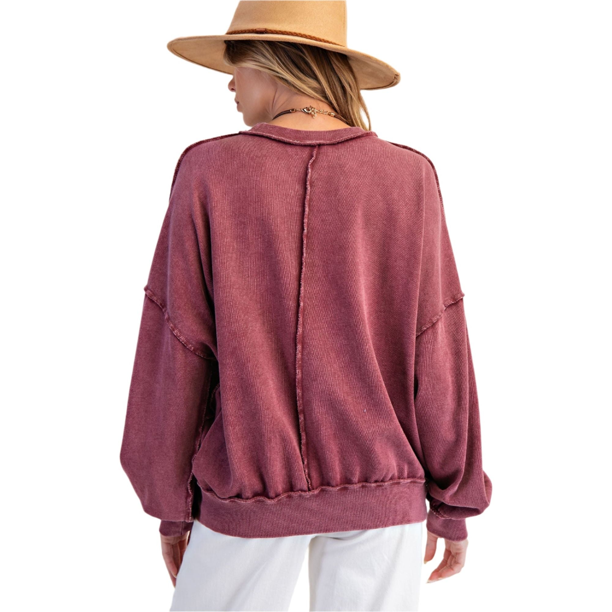 Cut out mineral wash pullover -Long sleeves -Dropped shoulders -Crew neckline -Ribbed band cuffs and hem -Exposed seam detailing -Front pockets -Relaxed and loose fit -Small measurments : Length - 25" & Bust - 27" & Sleeve - 19"