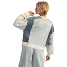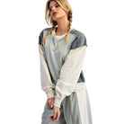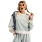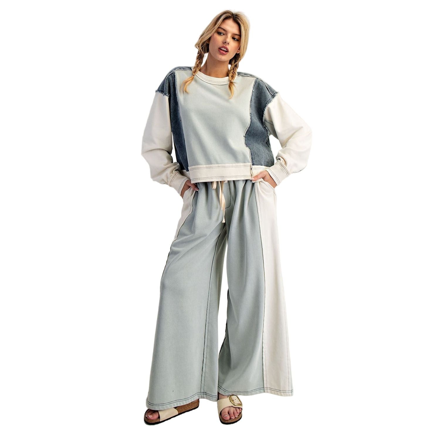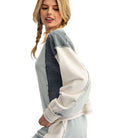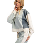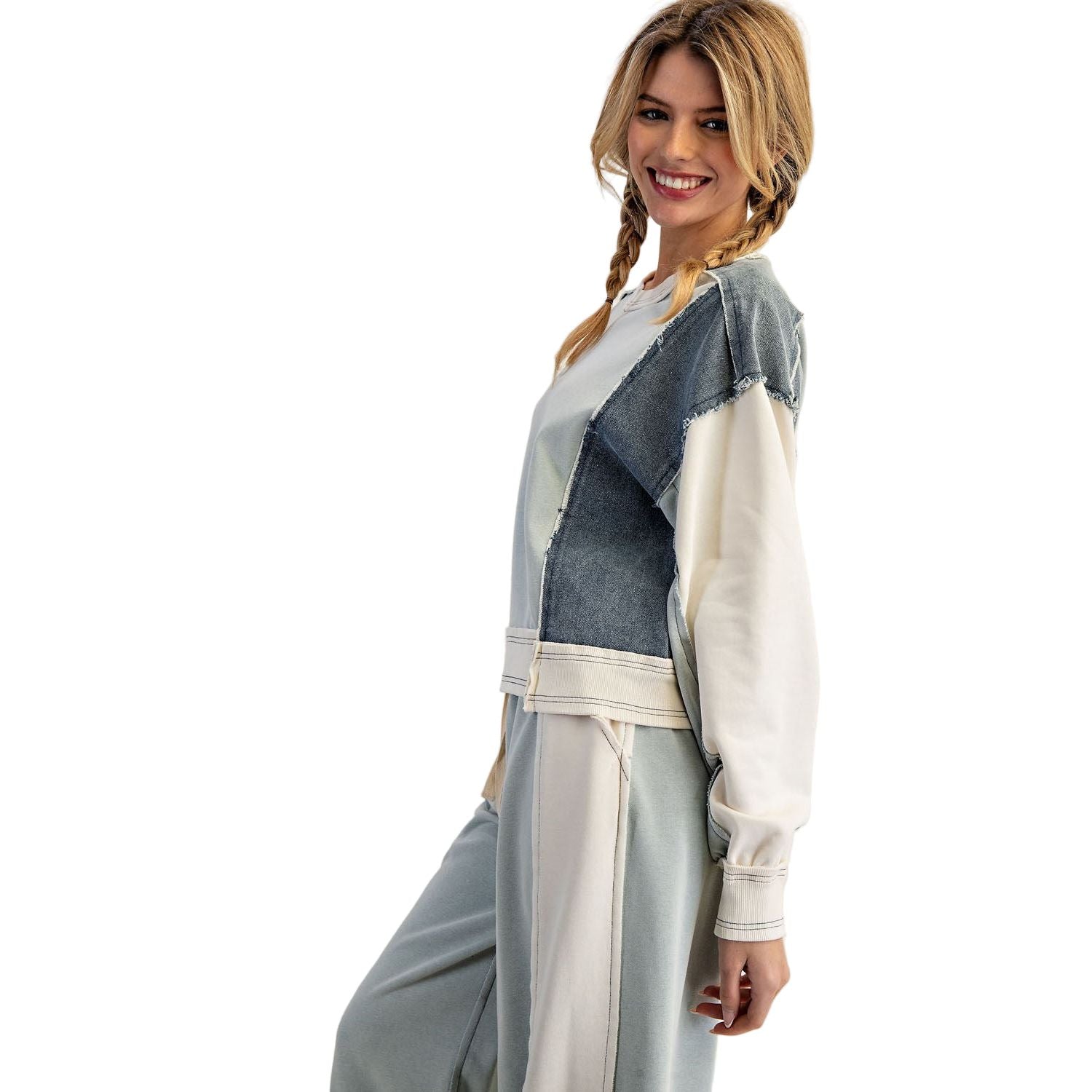 Product Detail: This color block pullover showcases a rounded neckline, a relaxed silhouette with raw edged denim patchwork at the shoulders and sides, contrast panel sleeves, wide ribbed trim at the hem and cuffs, and frayed seams throughout for a modern, deconstructed look.