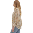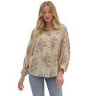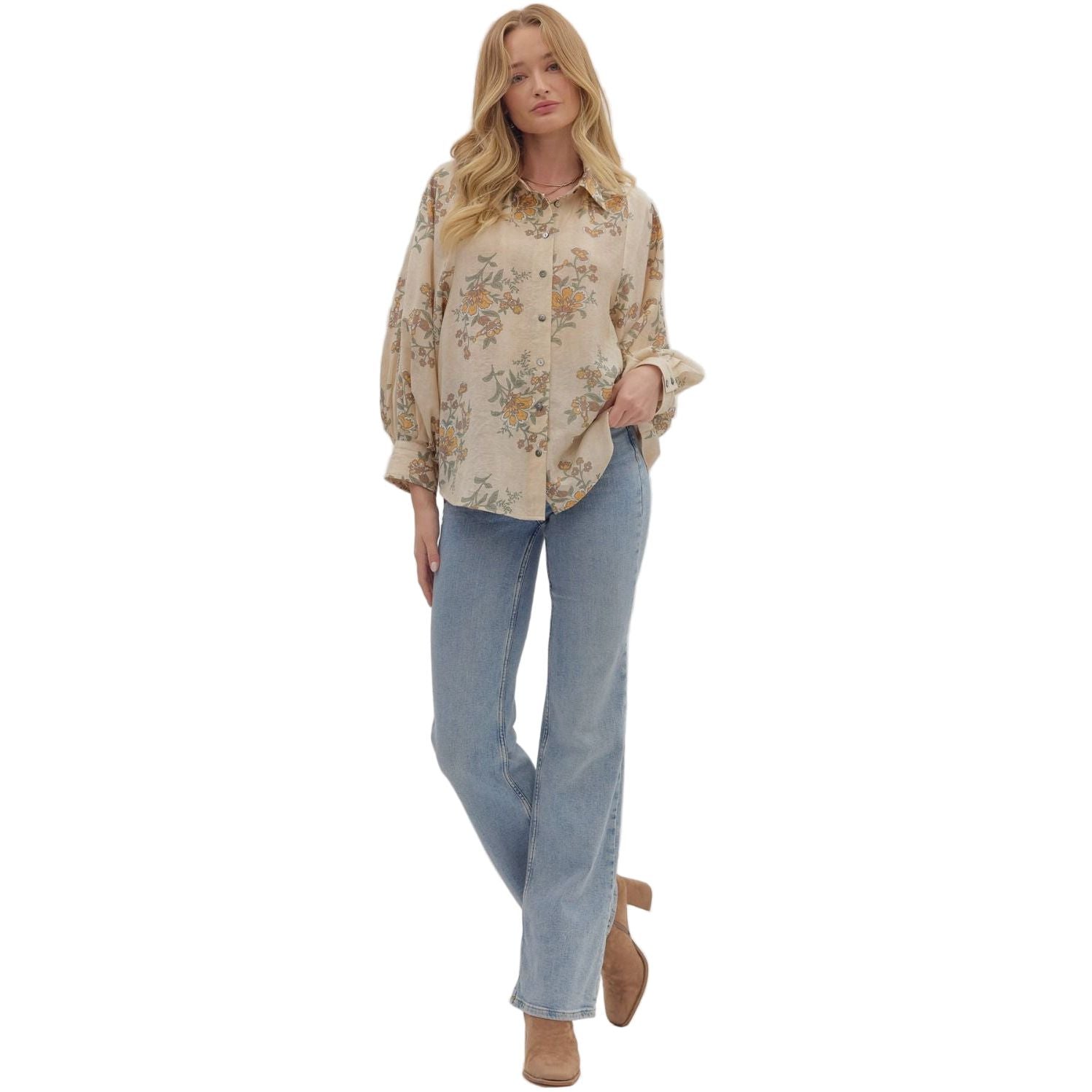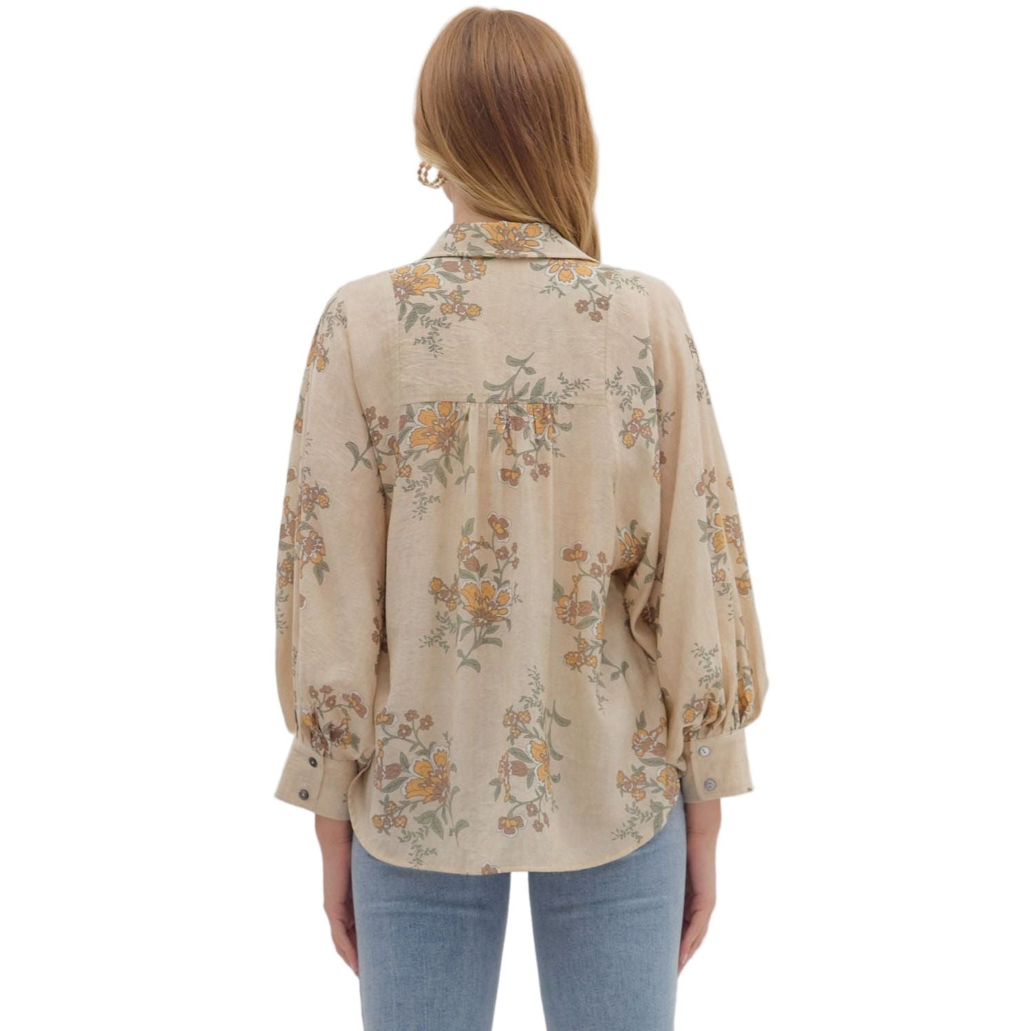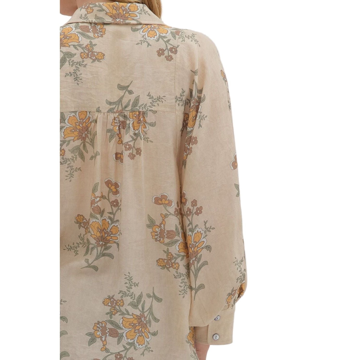 Floral print long sleeve top featuring button front closure and soft pleating at the shoulders and back yoke for added volume. Designed with a classic shirt collar and buttoned cuffs. Unlined. Non-sheer. Woven. Lightweight.