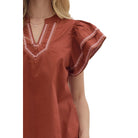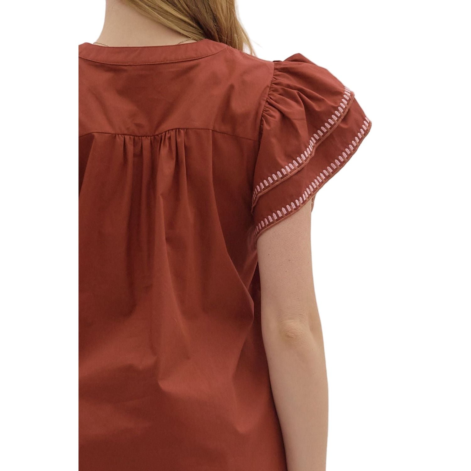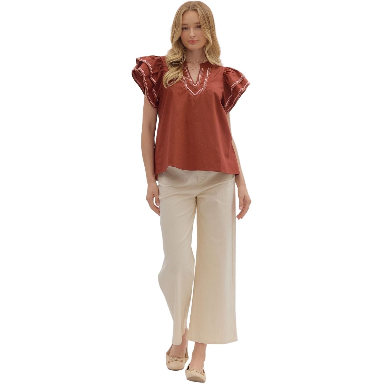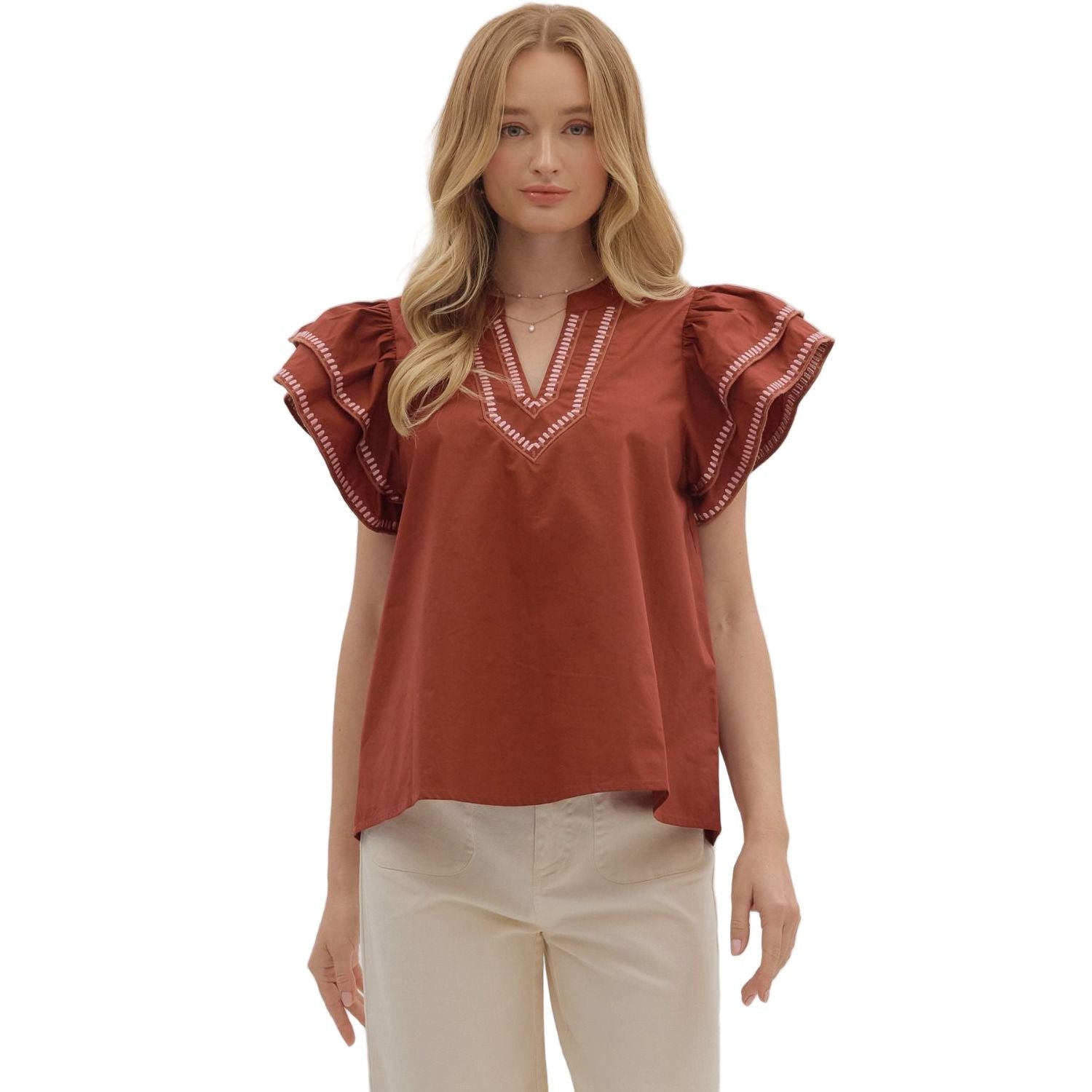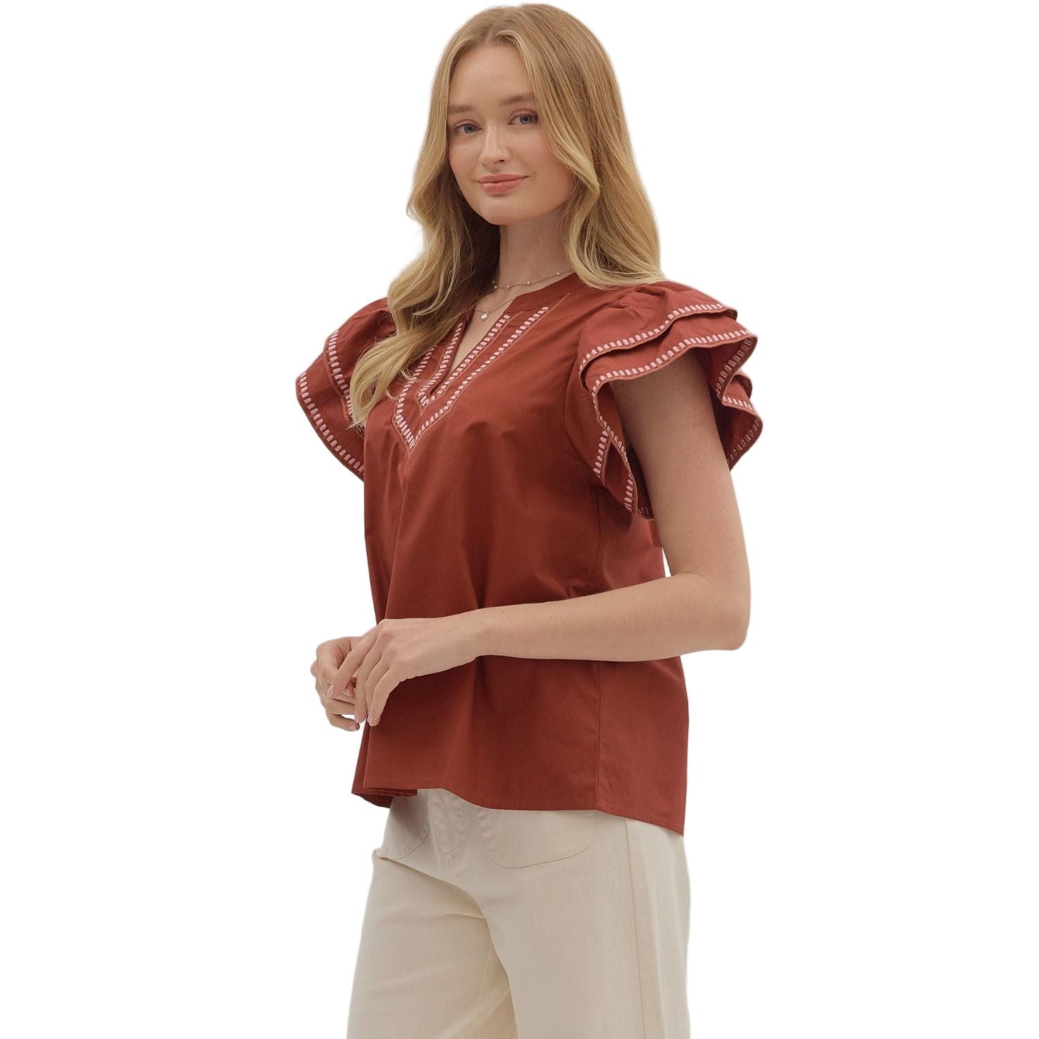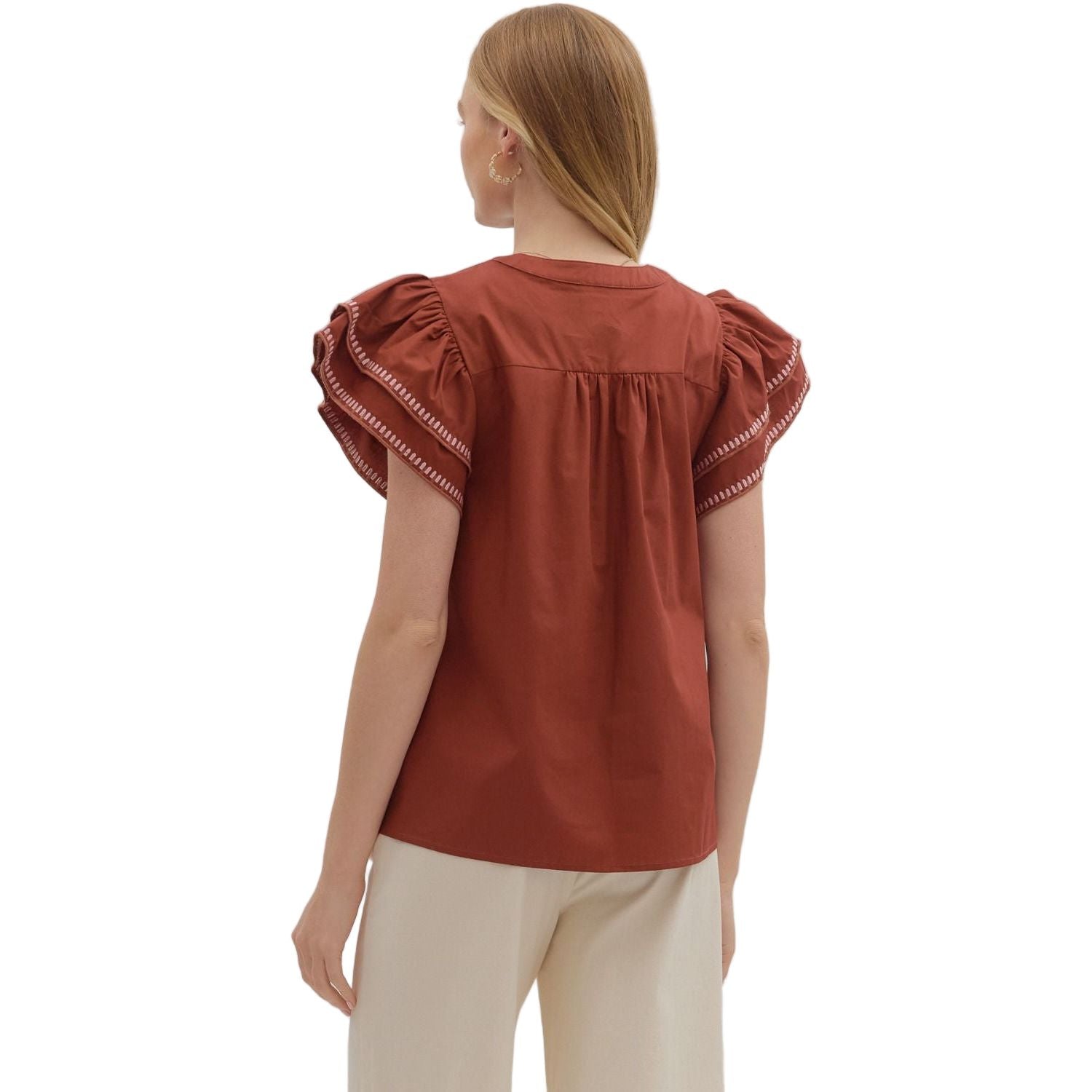 Solid layered ruffle flutter sleeve top featuring contrast embroidered trim V-neck. Unlined. Woven. Non-sheer. Lightweight.