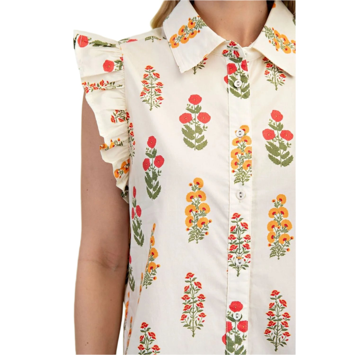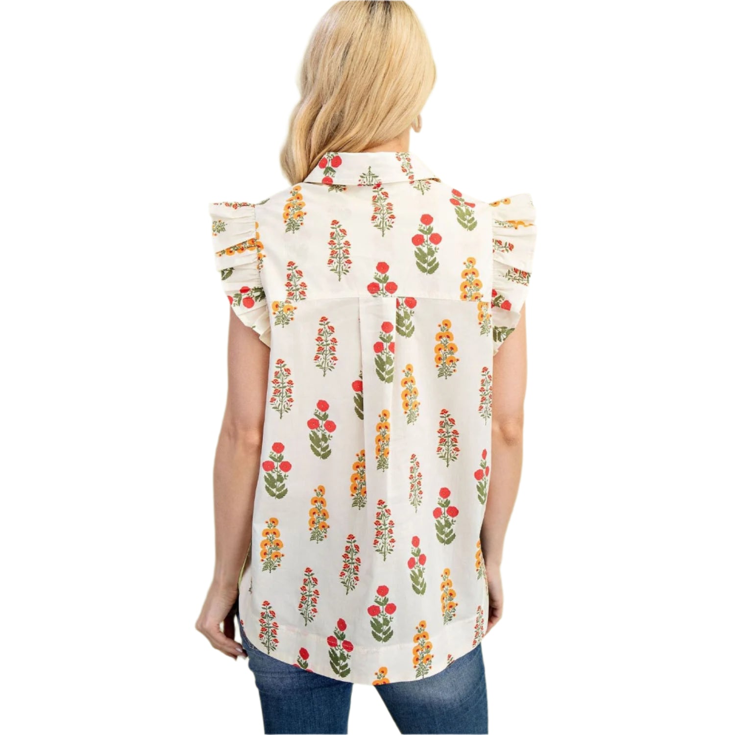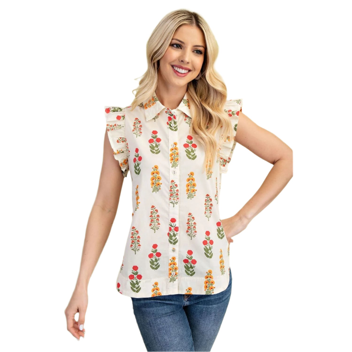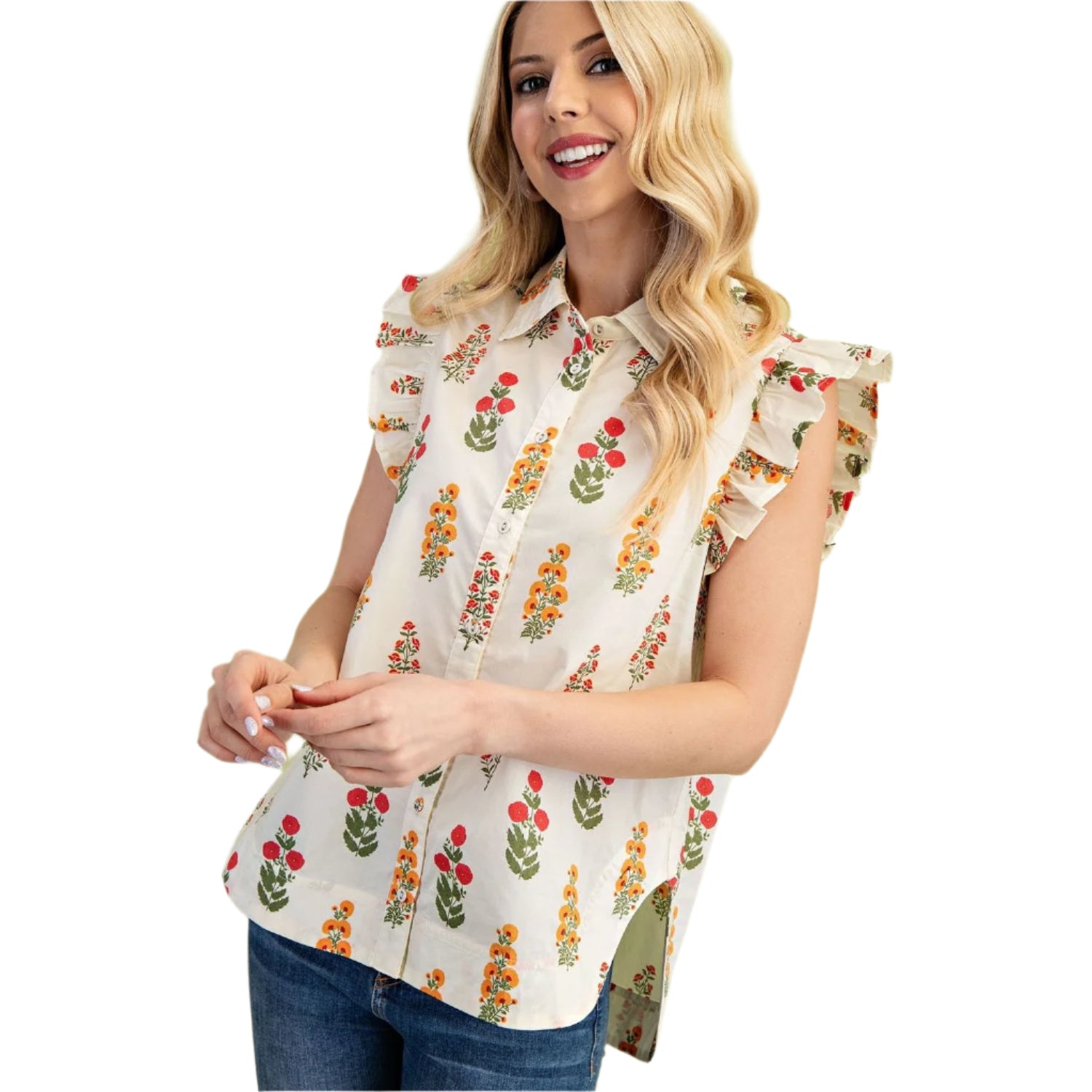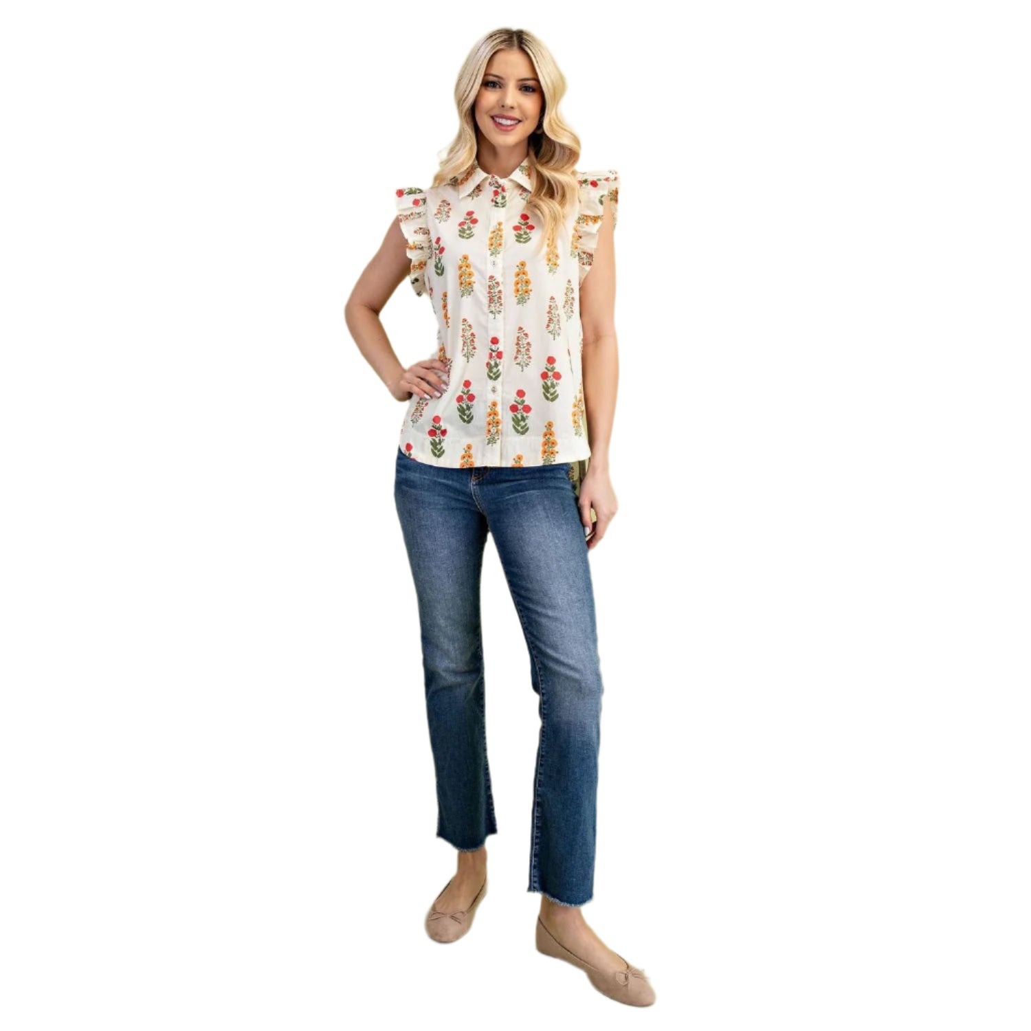 Floral Button Up Top with Ruffle Sleeves Model is 5'7" wearing a small.