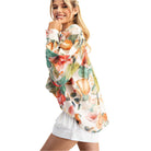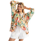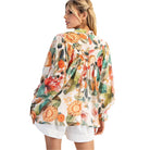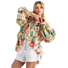 Product Detail: This billowy blouse showcases a vibrant allover floral print, a slight mock neckline with a split front and soft pleating, button front detailing, long balloon sleeves with buttoned cuffs, and gentle back pleats for a romantic and airy silhouette.
