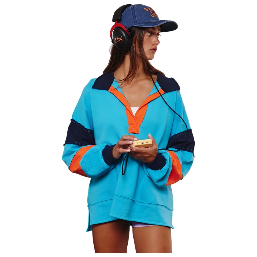 French Terry Color-block Collared Loose Fit Top - Big collar - Henley style - Long dolman sleeves - Contrast color block details - Raw edge details - Over sized