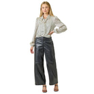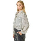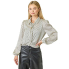 Geo Print Scarf Blouse Gold scarf adjuster Long bubble sleeves Hidden button down Collared V-neck Draped twist-front hem with subtle pleating -100% Polyester -Model wears: S / Model height: 5' 9"