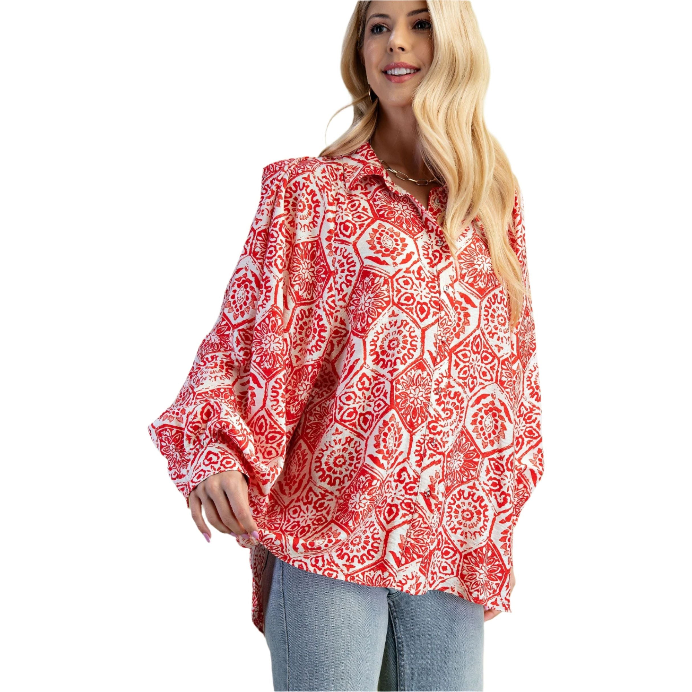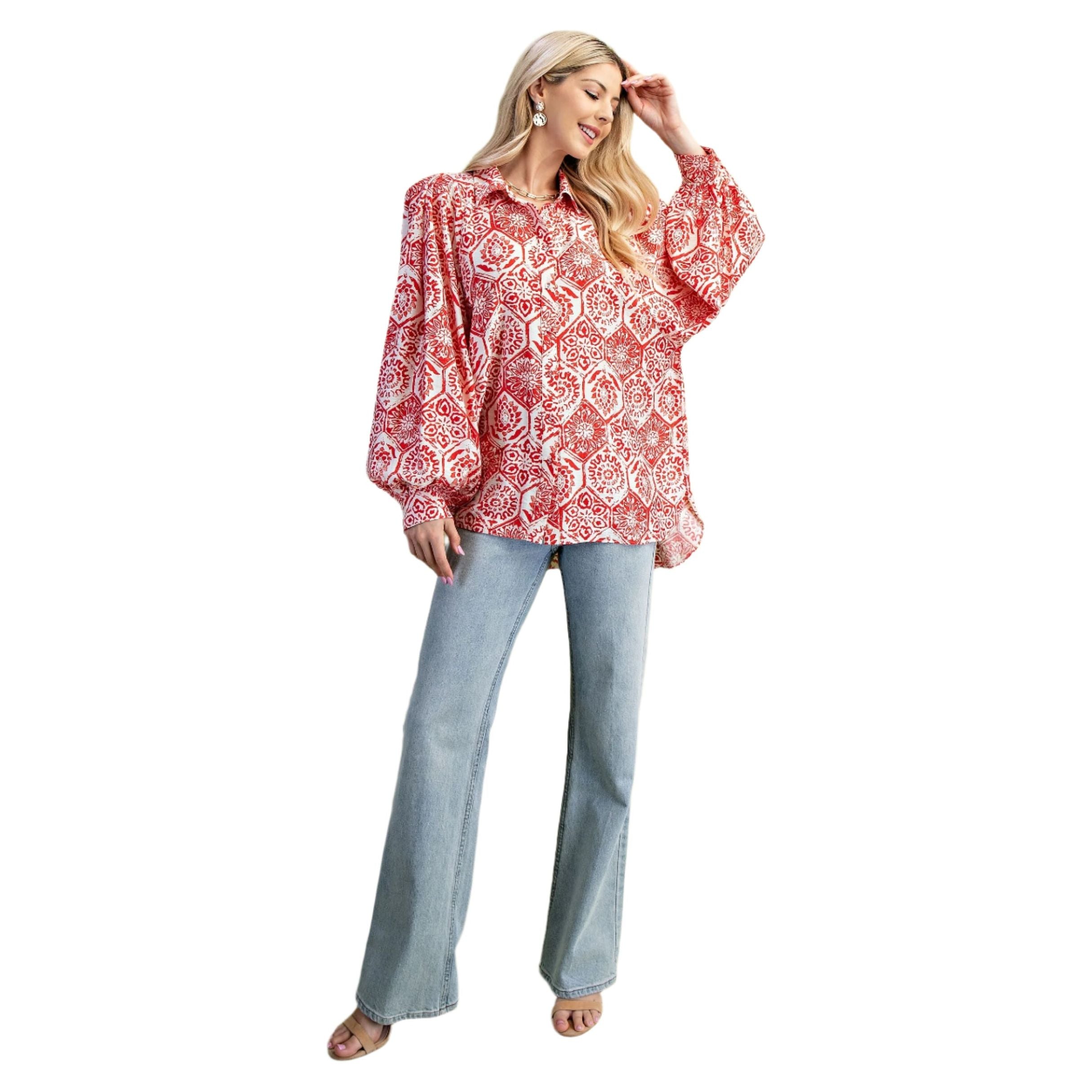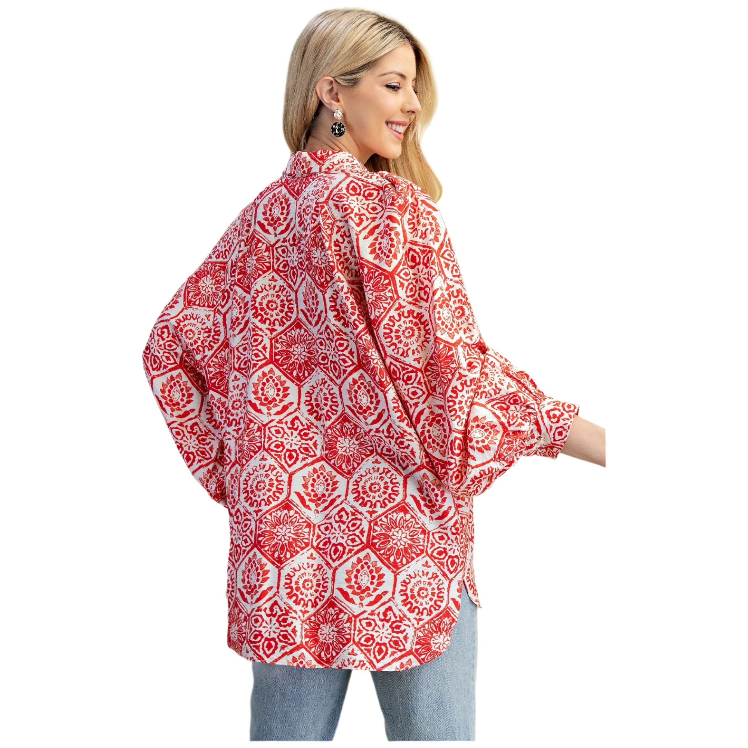 Women's Hexagonal Floral Print Oversized Button Down Shirt TG1912