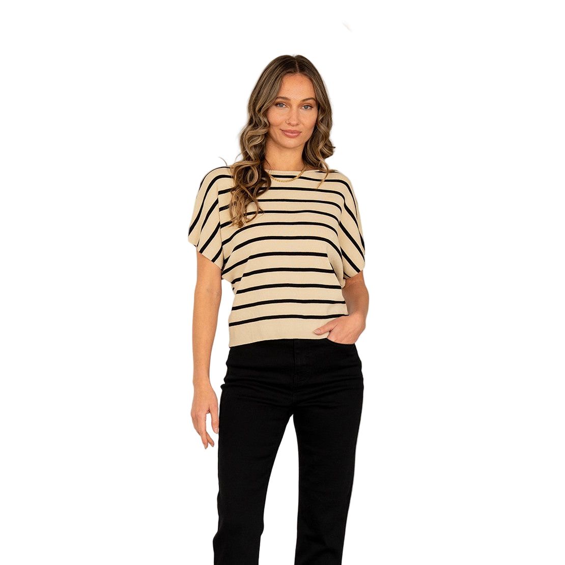 This striped knit top features a relaxed silhouette with dolman-style short sleeves for an effortlessly chic look. The soft, lightweight fabric is complemented by clean horizontal lines and a wide hem for a polished finish. Perfect for dressing up or down, it's a go-to piece for laid-back sophistication. * Style Number ET6246 * Relaxed Fit * Striped Top * Dolman Sleeves Model is 5' 8 and wears a size Small