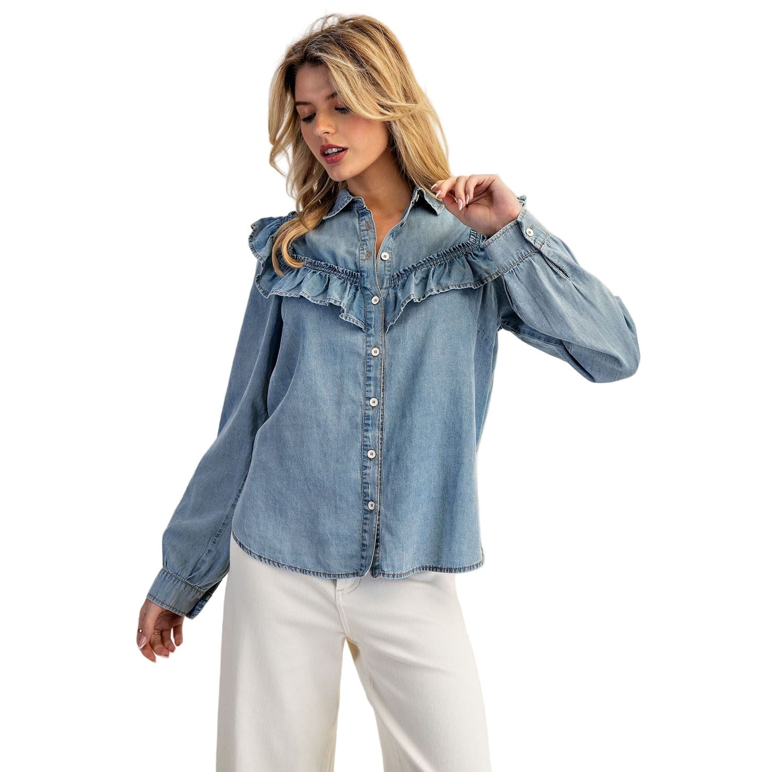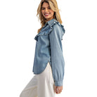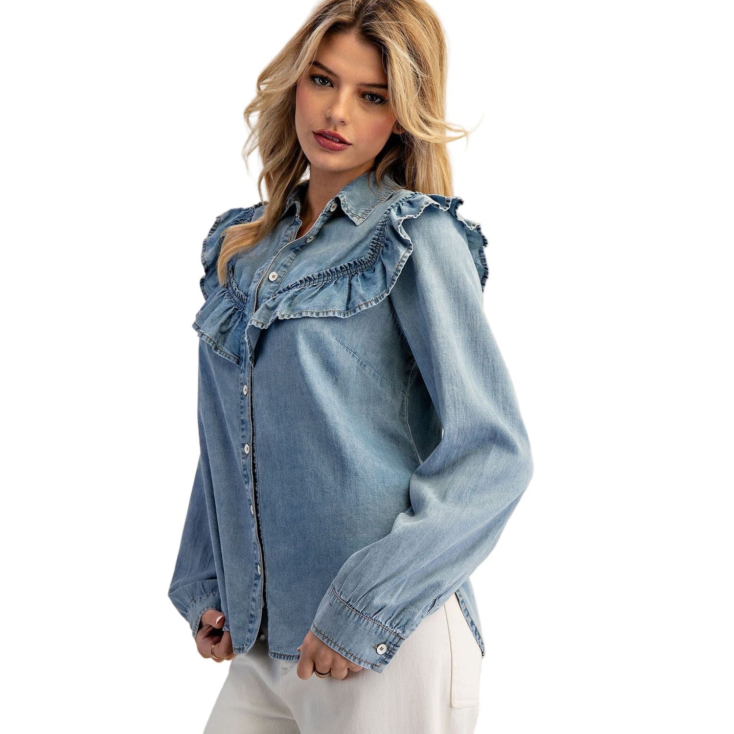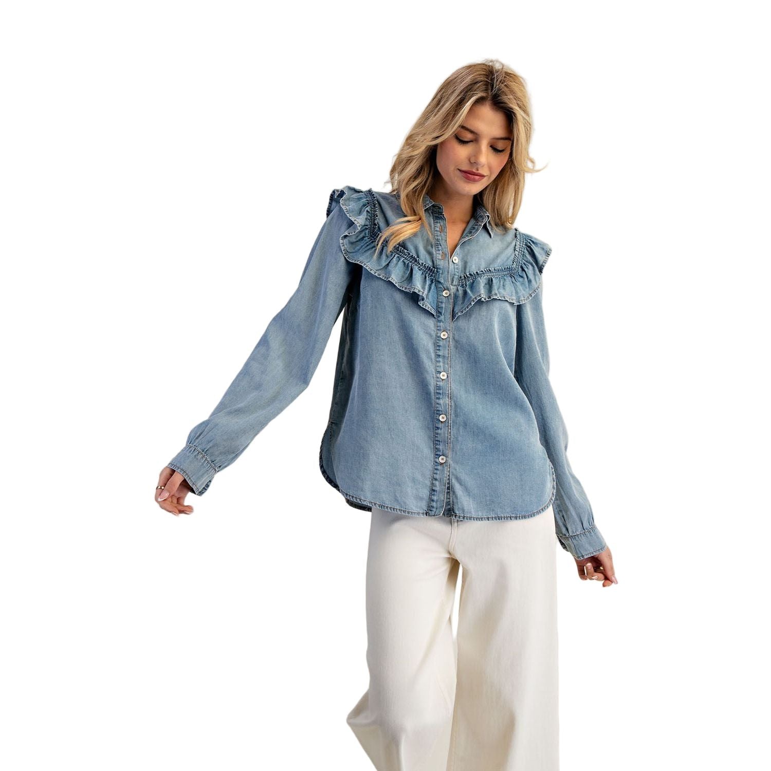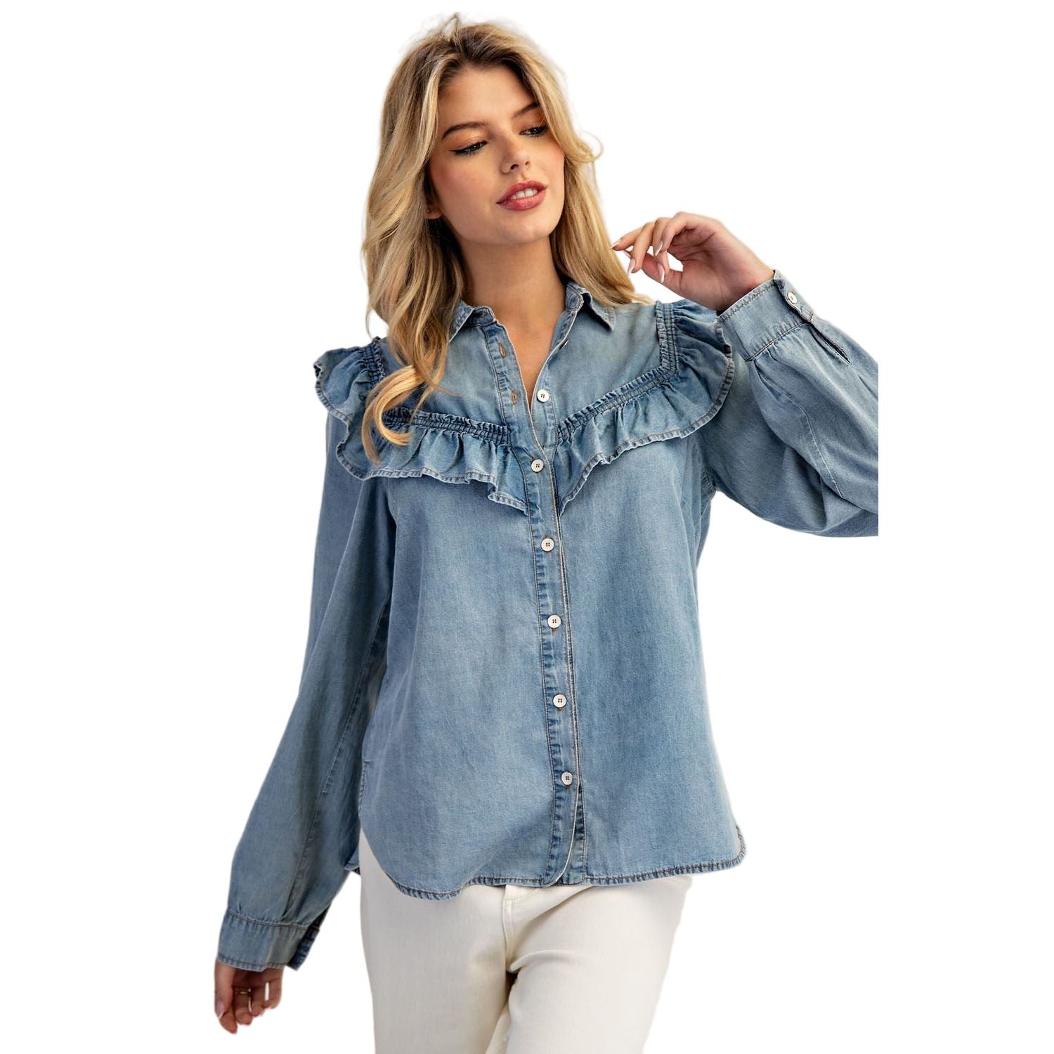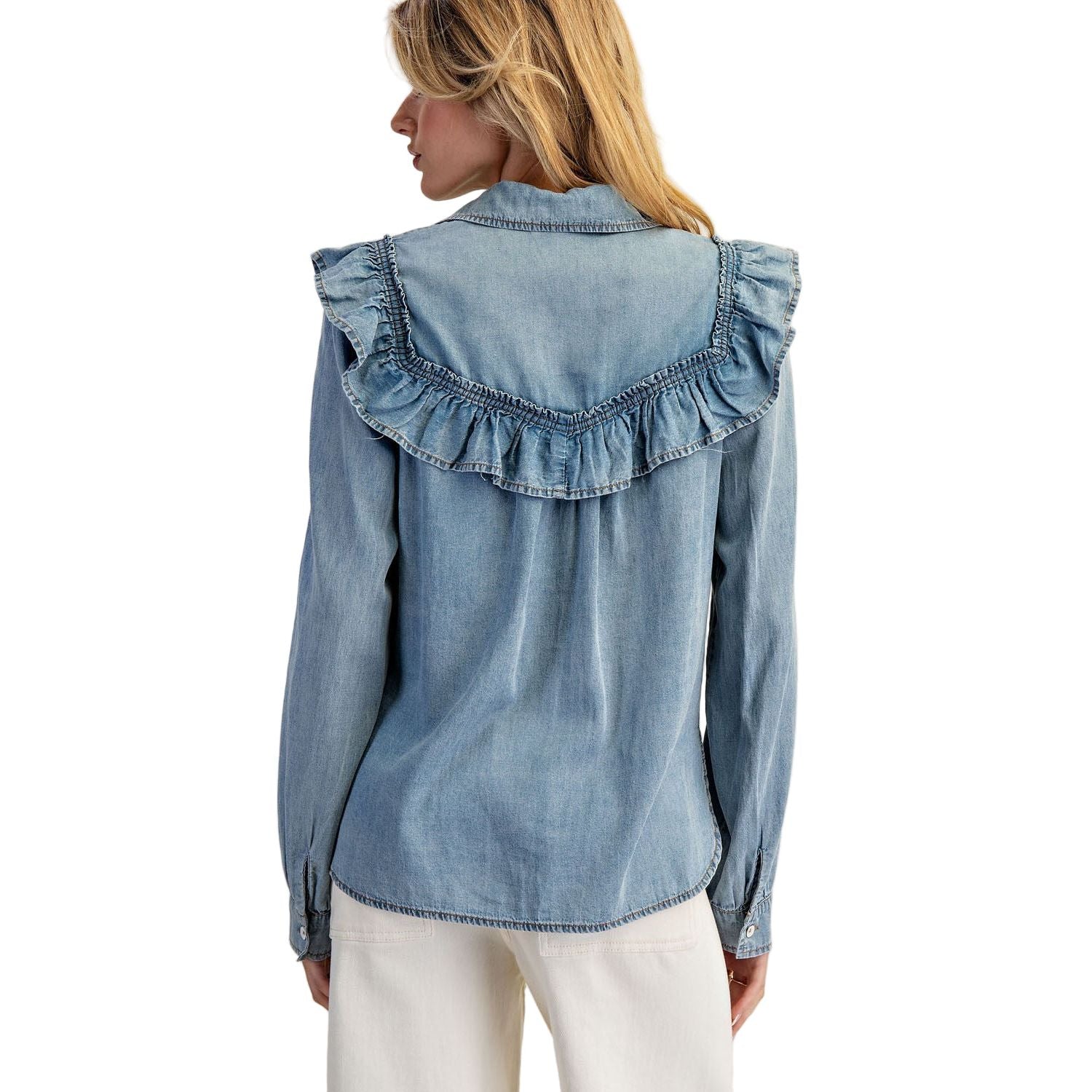 Product Detail: This enzyme, stone, bleach and snow washed chambray button up top features a collared neckline, long sleeves with buttoned cuffs, a shirred ruffle yoke that extends around the shoulders and back, and a curved high low hem creating slight side slits for a soft, feminine twist on a classic denim look.