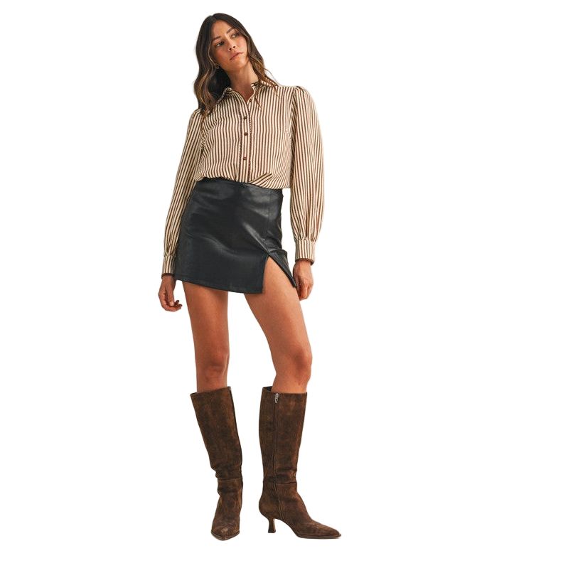 Stripe Scallop Trim Detail Puff Sleeve Blouse - Textured stripe woven fabric - Button down - Scallop trimmed - Long puff sleeve - Relaxed fit