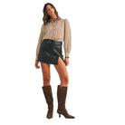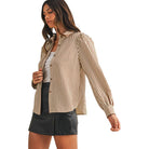 Women's Stripe Scallop Trim Detail Puff Sleeve Blouse AT3006W-MOCHA