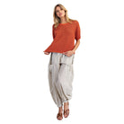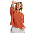 Product Detail : This knit top features a wide waffle texture, short sleeves with clean banded edges, a ribbed crew neckline, and a slightly boxy silhouette for a relaxed yet structured look.