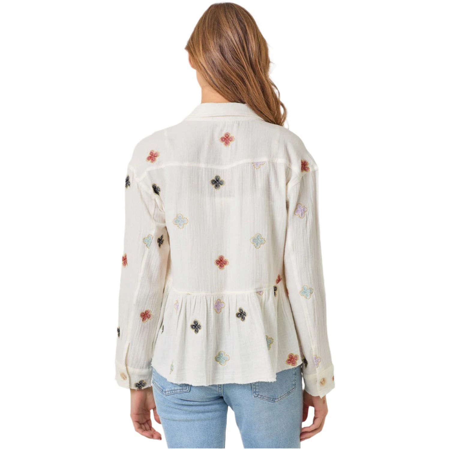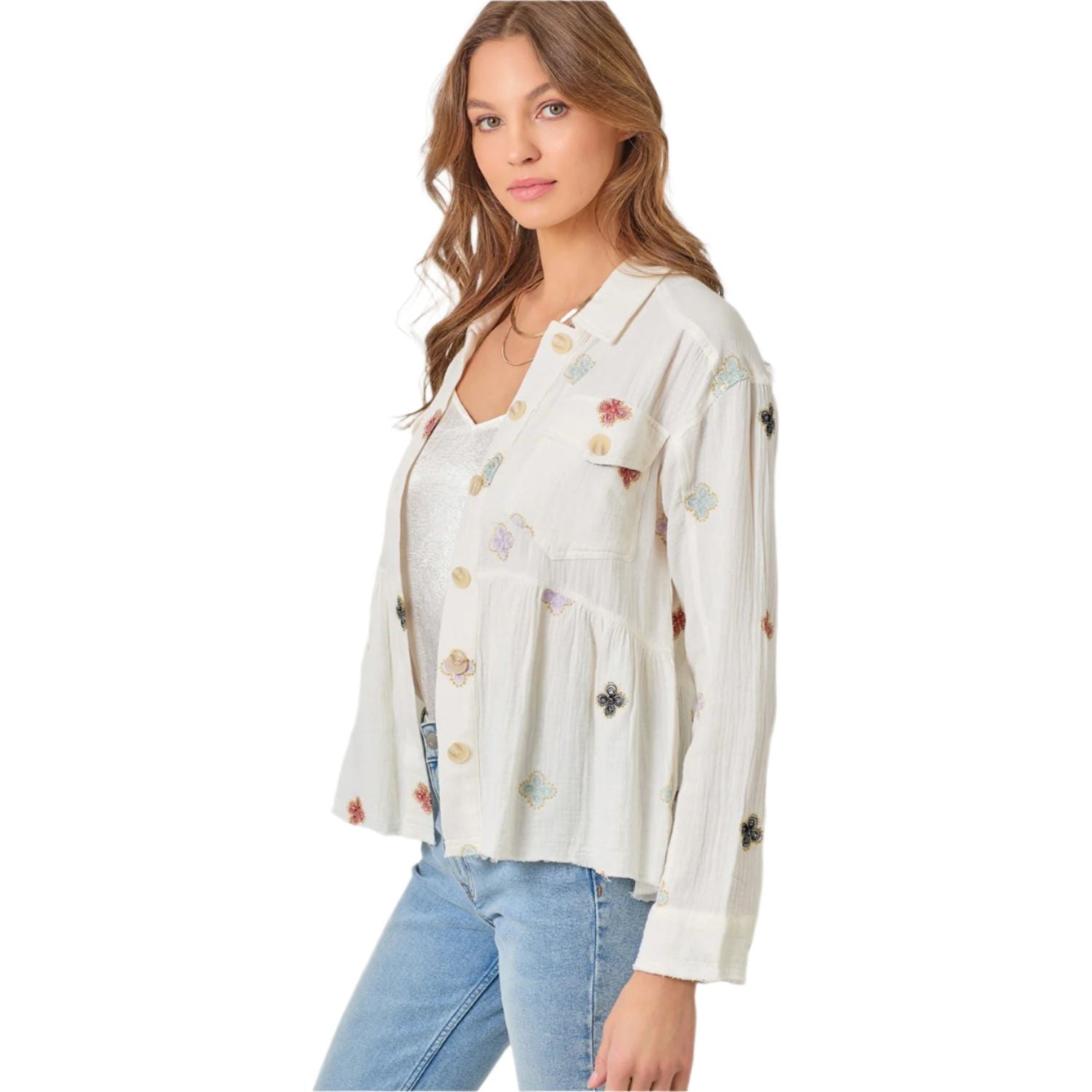 Washed Peplum Jacket Embroidered throughout Bust pockets Button down -100% Cotton -Model wears: S / Model height: 5' 10"