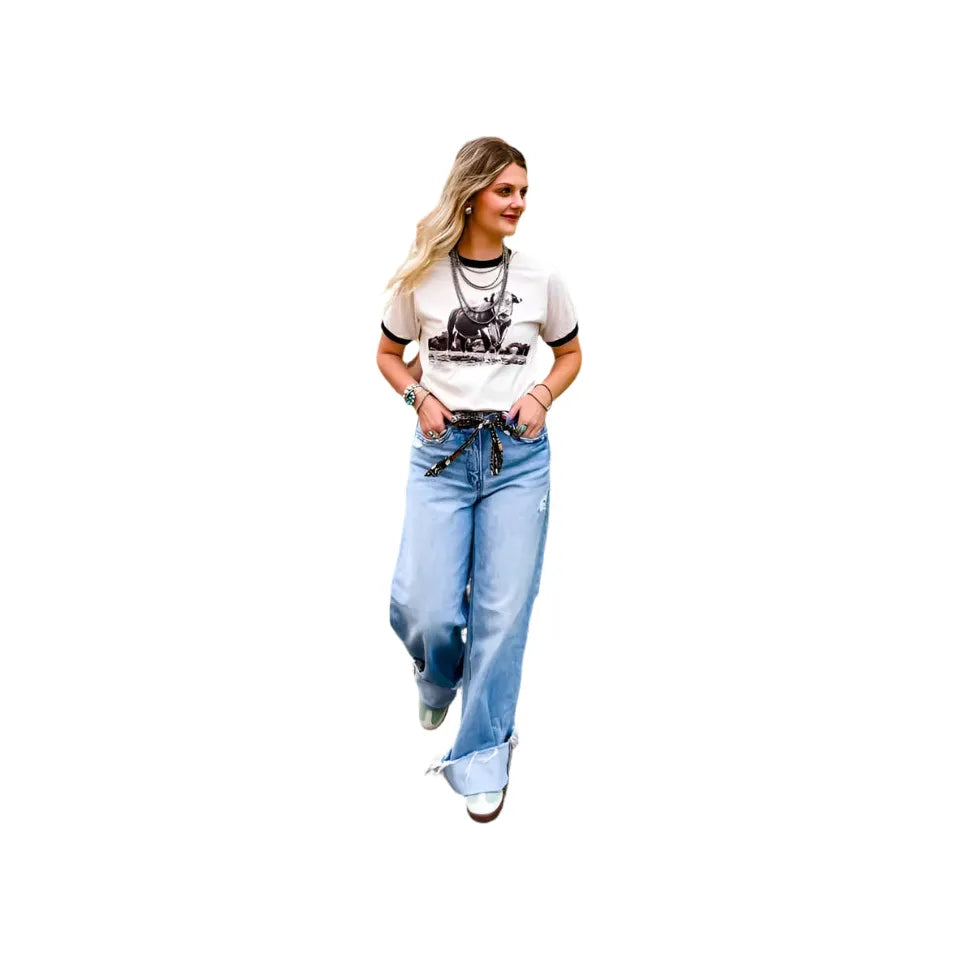 Women's White and Black T-shirt with Bull Printed On The Front.