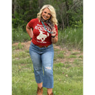 Shown on a Bella Canvas solid black and brick t-shirt, and an Alternative camo t-shirt.