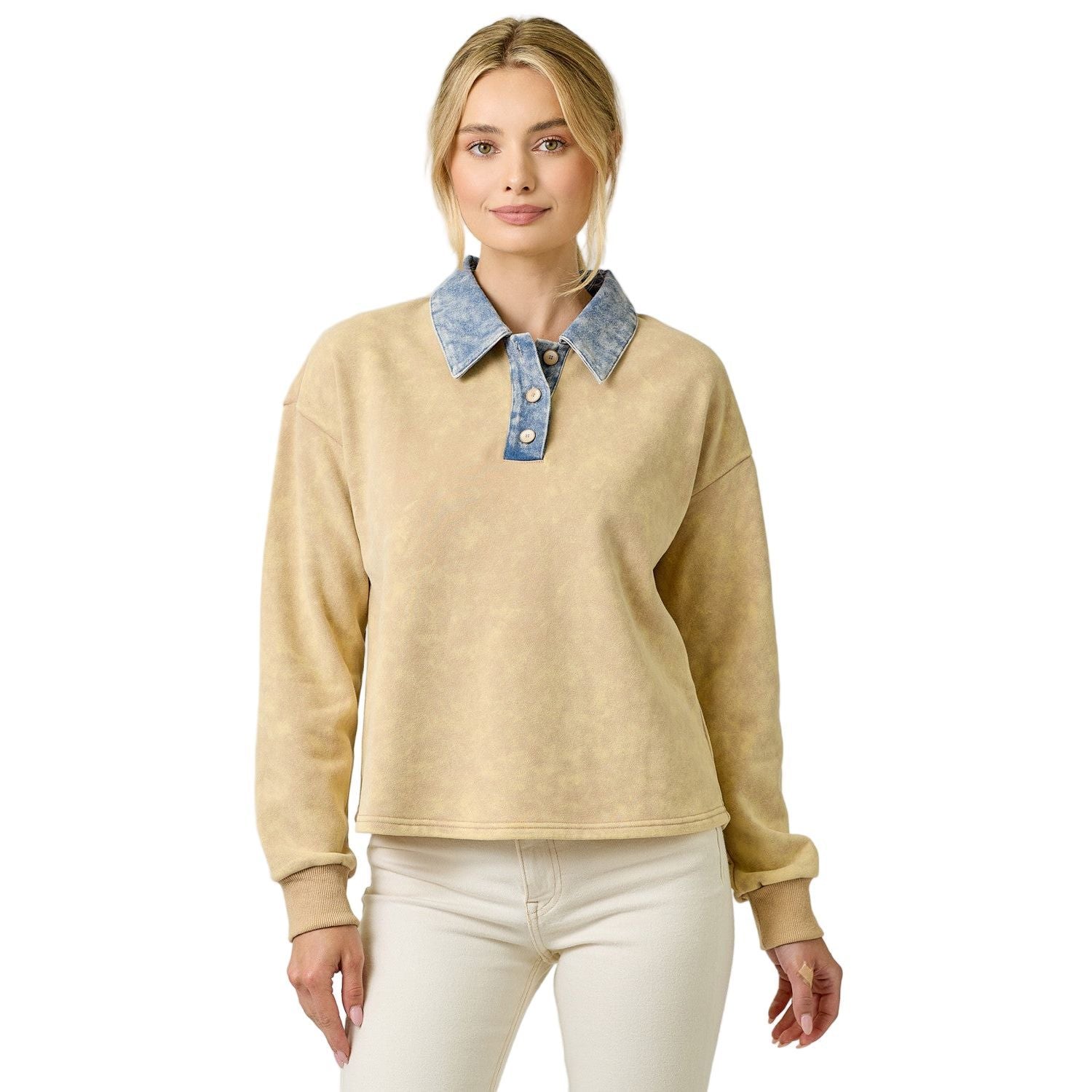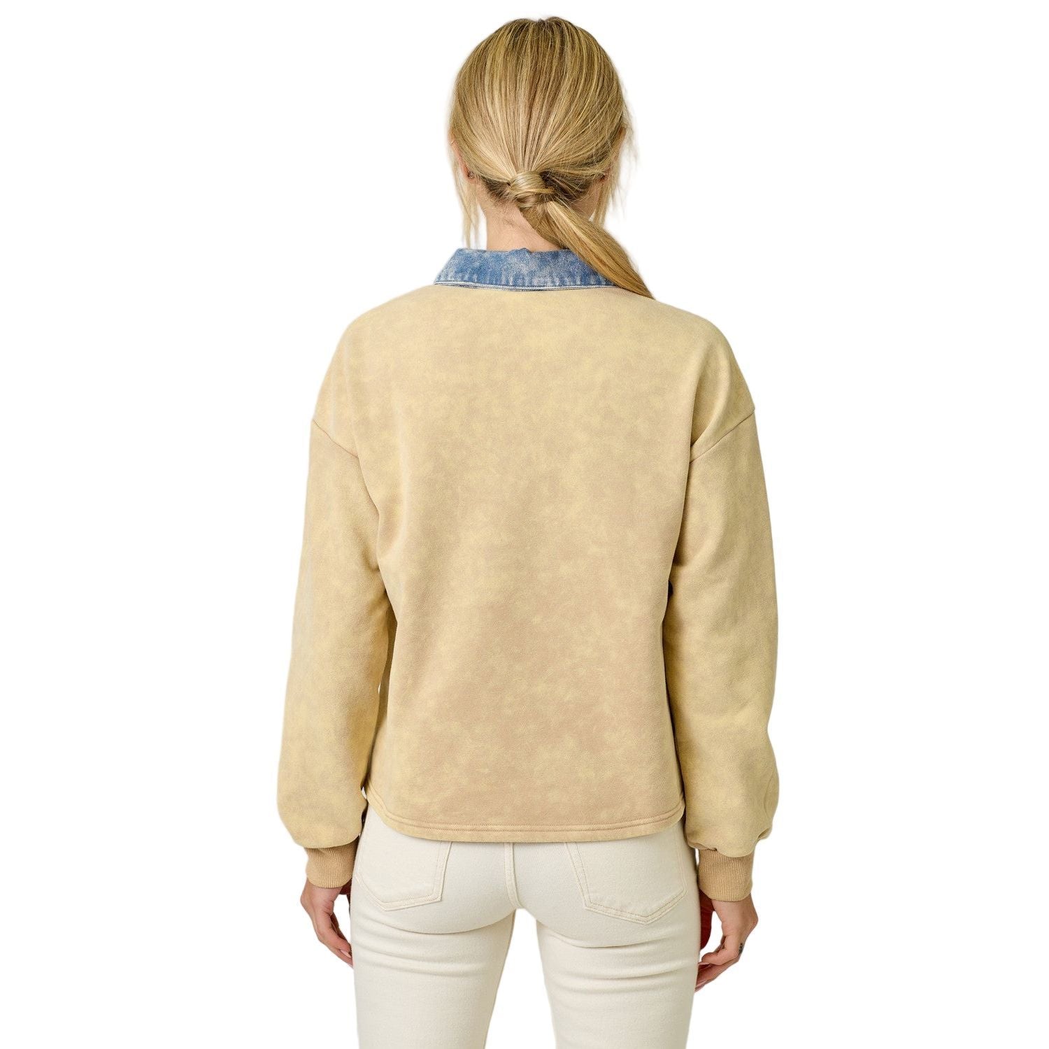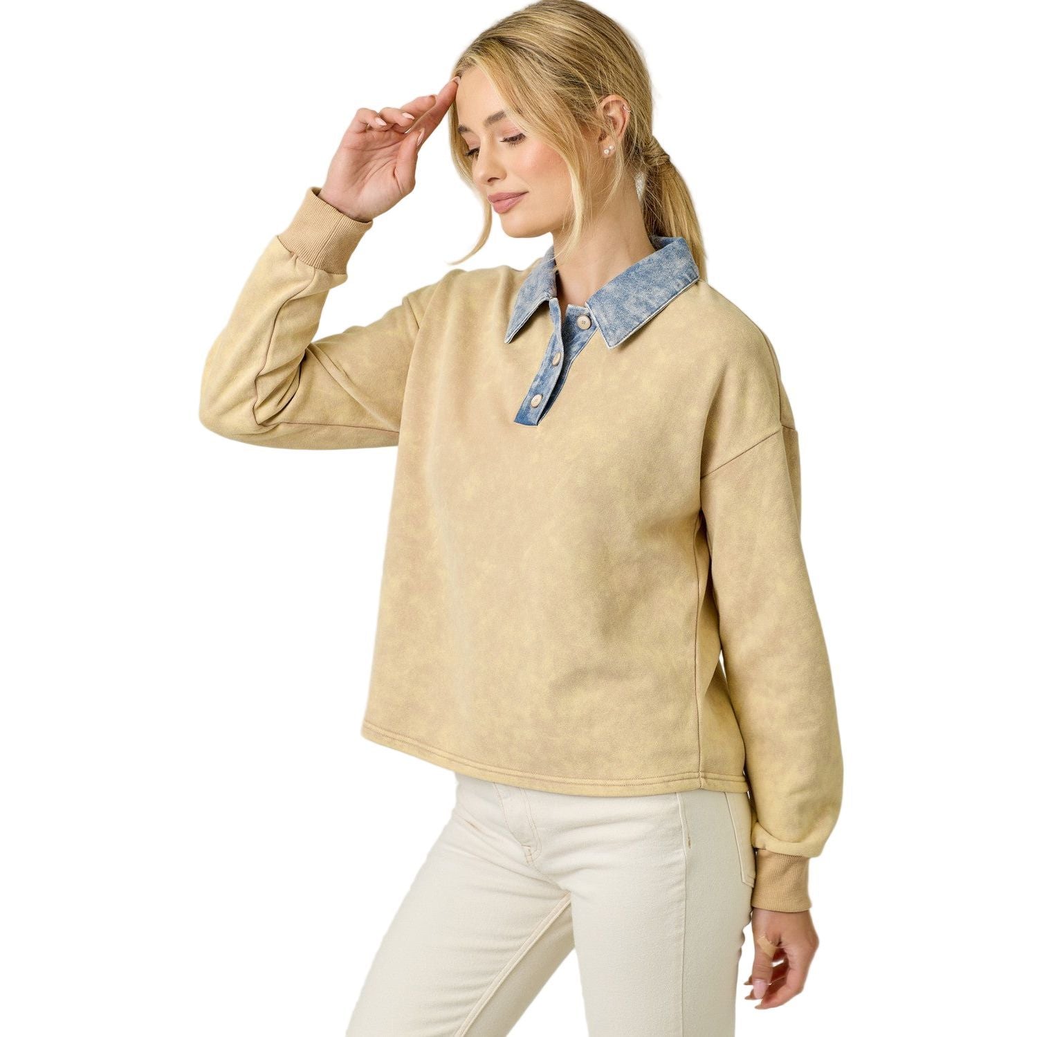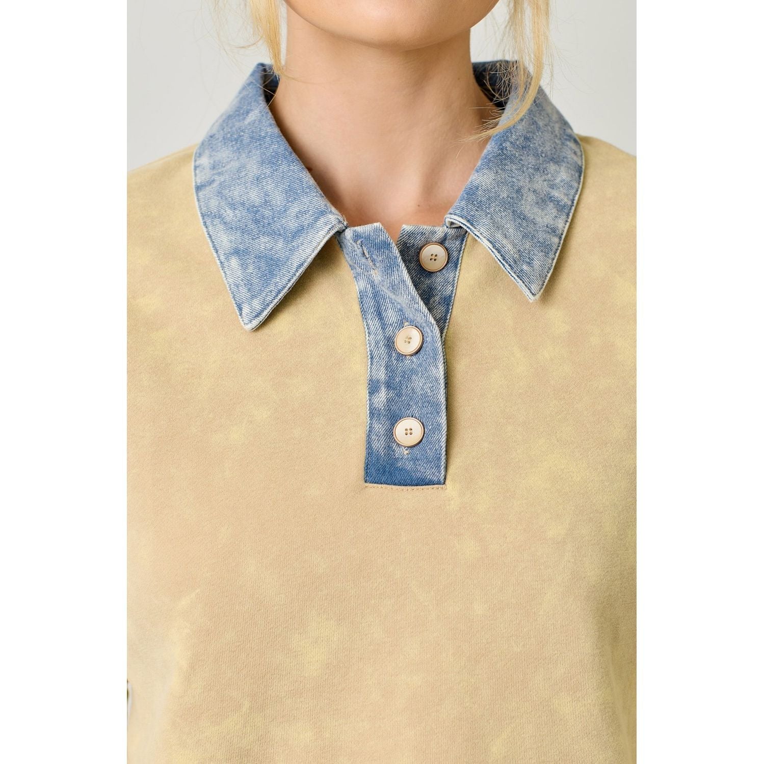 Denim Collar Washed Polo Shirt Buttoned neckline Long bubble sleeves Fleece inside -Self 70% Cotton, 30% Polyester / Contrast 85% Cotton, 15% Polyester -Model wears: S / Model height: 5' 9"