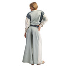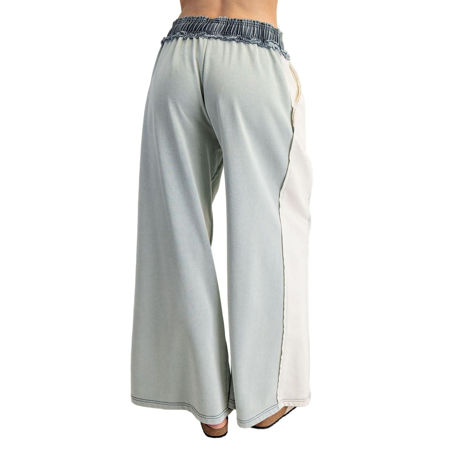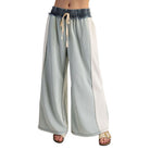 Product Detail: These color block pants feature contrast side panels, a denim drawstring waistband with frayed detailing, exposed seaming throughout, roomy side pockets, and a wide leg silhouette for a bold and laid back streetwear vibe.
