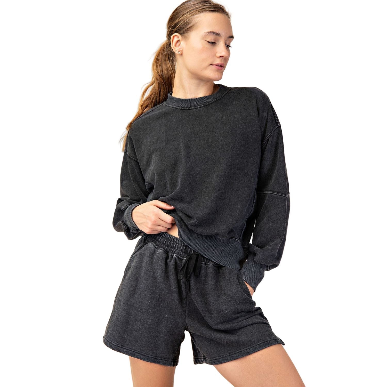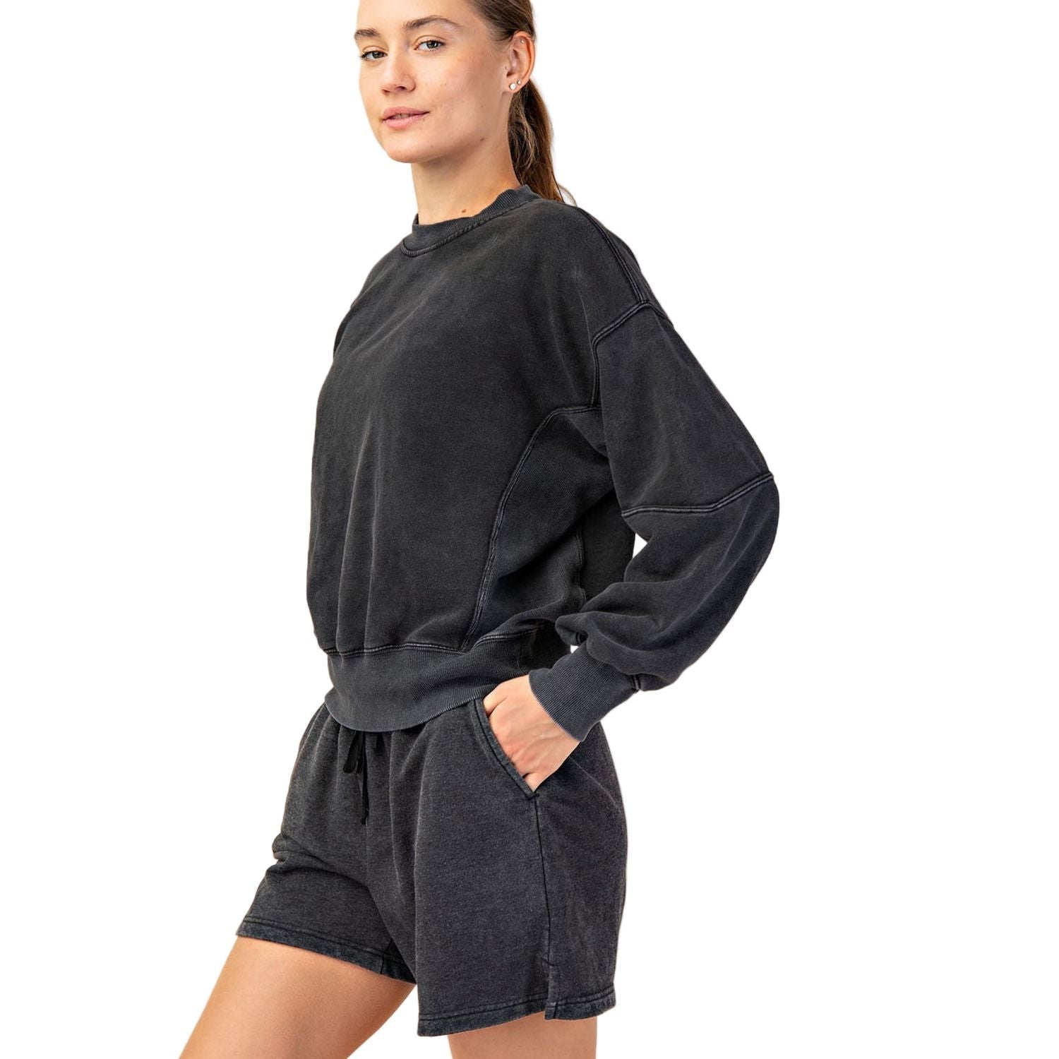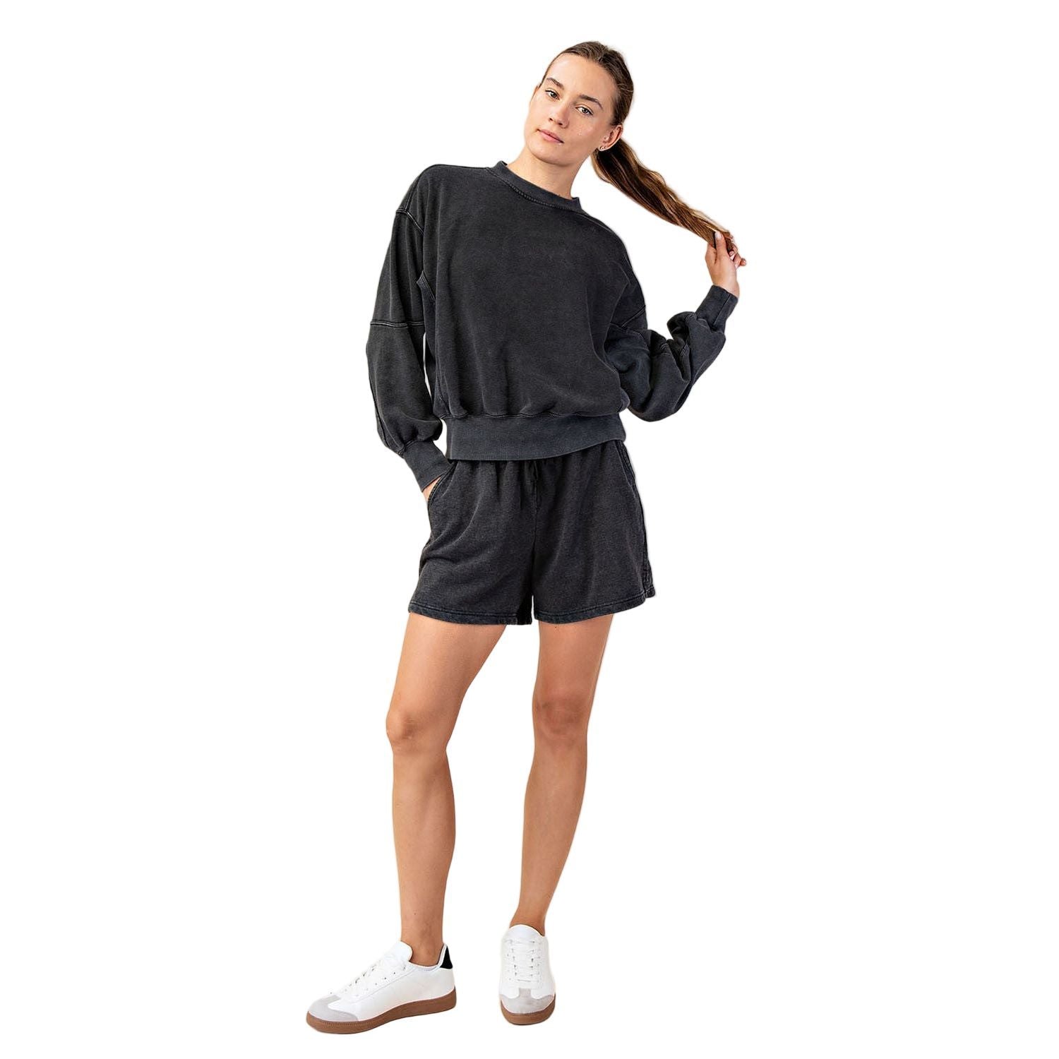 Discover the ultimate in comfort and style with our Long Sleeve Pullover and Matching Short Set. Crafted from mineral-washed French terry fabric, this set features a relaxed fit and detailed seaming, perfect for lounging at home or on the go. Elevate your casual wardrobe with this effortlessly chic duo. Features: - French Terry fabric - Mineral washed - Long Sleeve Pullover with matching short - Relaxed fit - Round neck - Dropped shoulder - Seaming details - Ribbed neckline, cuffs, and hem - Adjustable elastic waistband - Side silt details - Side pockets