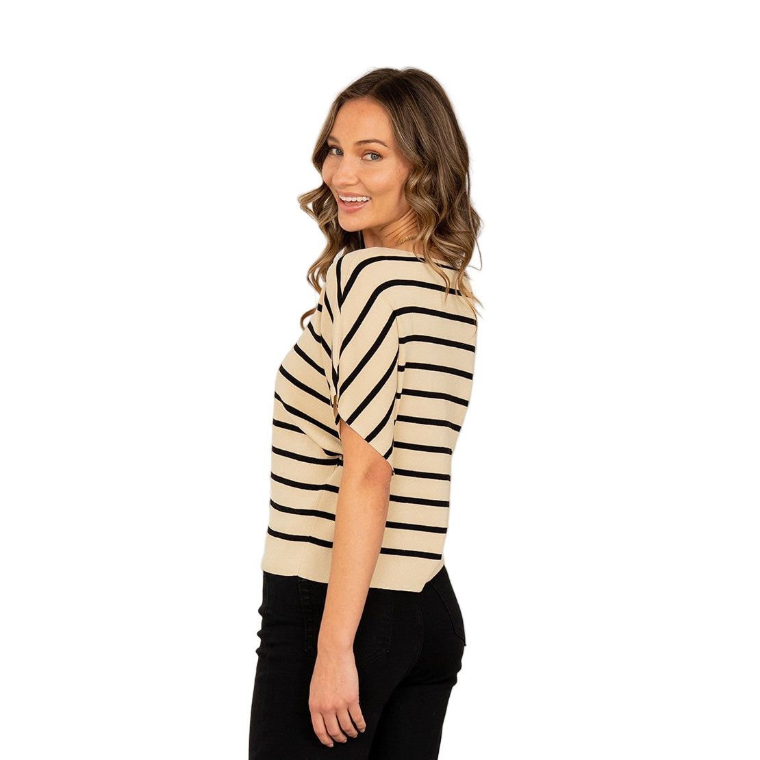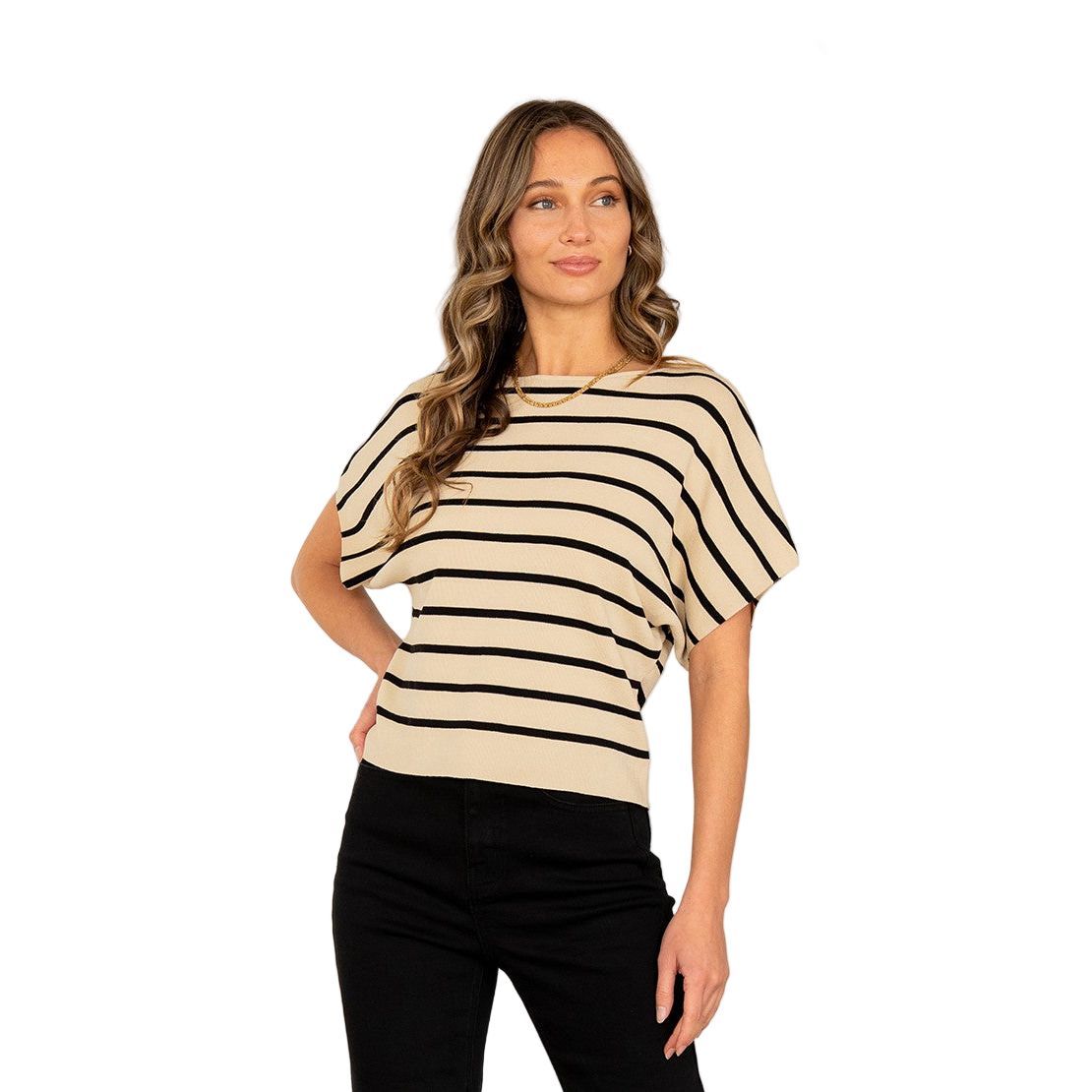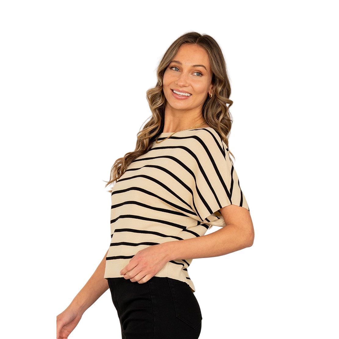 This striped knit top features a relaxed silhouette with dolman-style short sleeves for an effortlessly chic look. The soft, lightweight fabric is complemented by clean horizontal lines and a wide hem for a polished finish. Perfect for dressing up or down, it's a go-to piece for laid-back sophistication. * Style Number ET6246 * Relaxed Fit * Striped Top * Dolman Sleeves Model is 5' 8 and wears a size Small