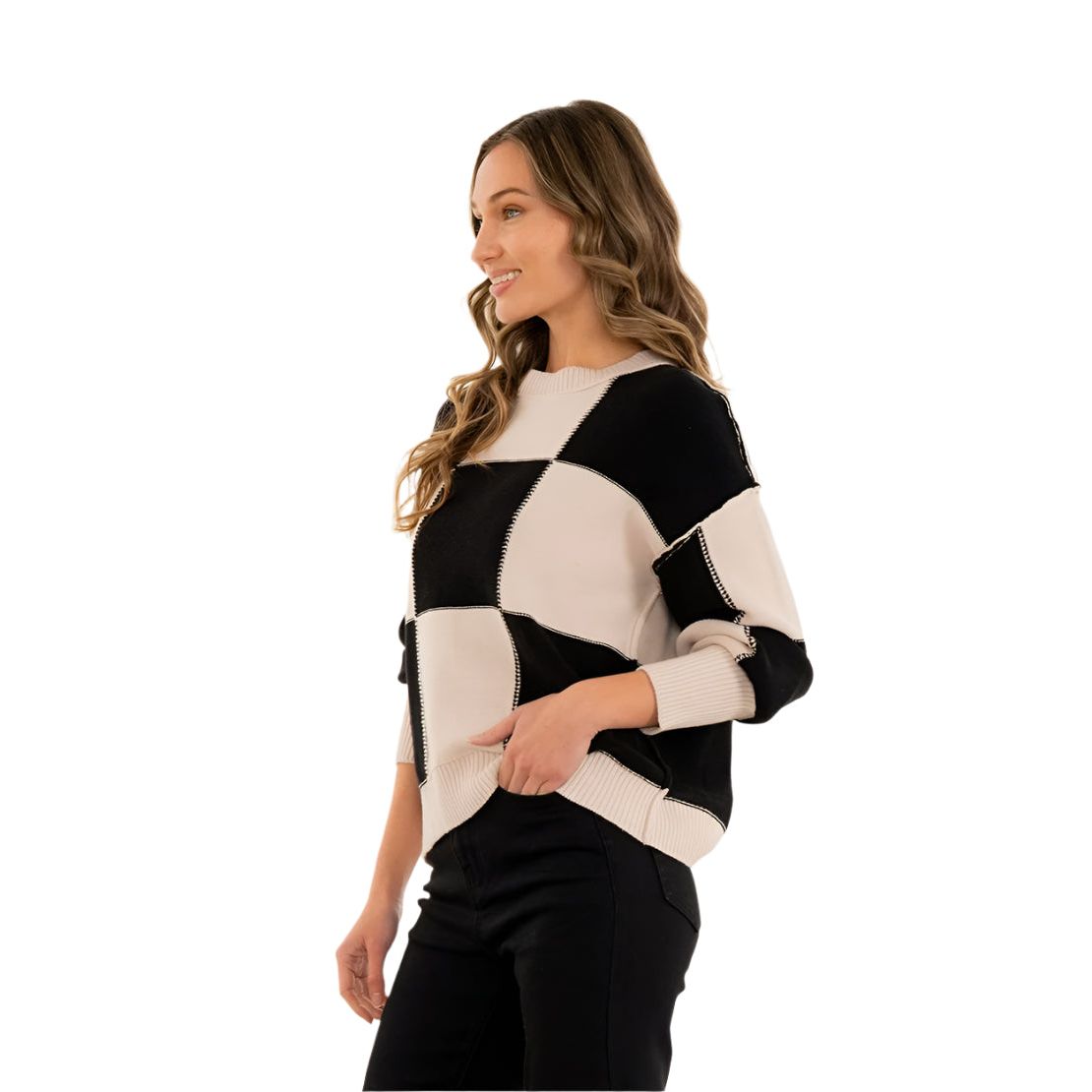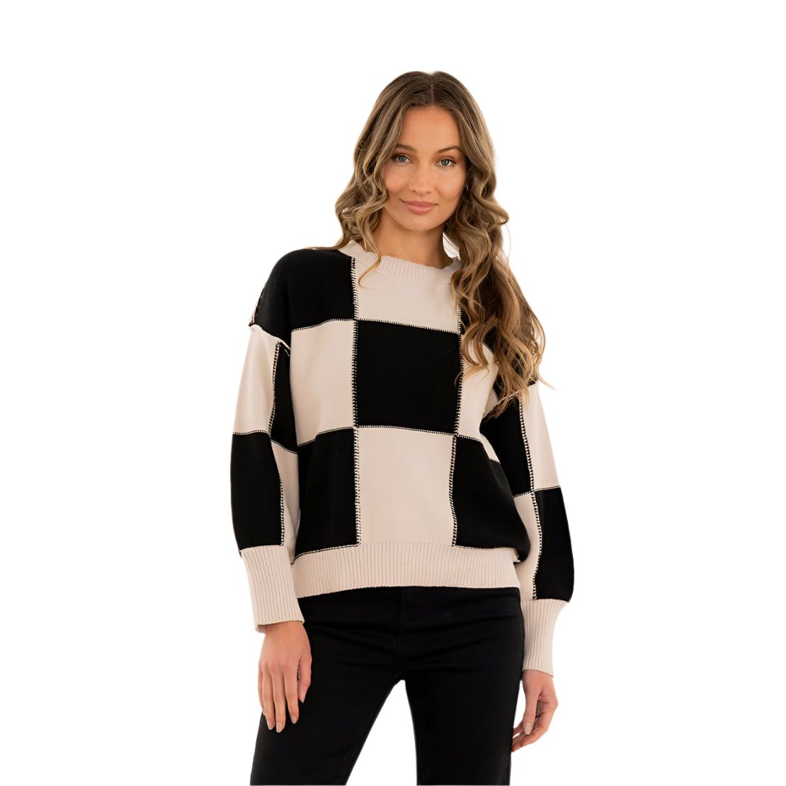 This cozy pullover showcases a bold taupe and black checkerboard pattern with exposed contrast stitching for a stylish, modern touch. The relaxed fit and dropped shoulders add to its effortless comfort. Finished with ribbed trim at the neckline, cuffs, and hem for a polished look. * Style Number ET6271 * Relaxed Fit * Pullover Sweater * Checkerboard Pattern * Dropped Shoulders * Contrast Stitching * Ribbed Trim Model is 5' 8 and wears a size Small