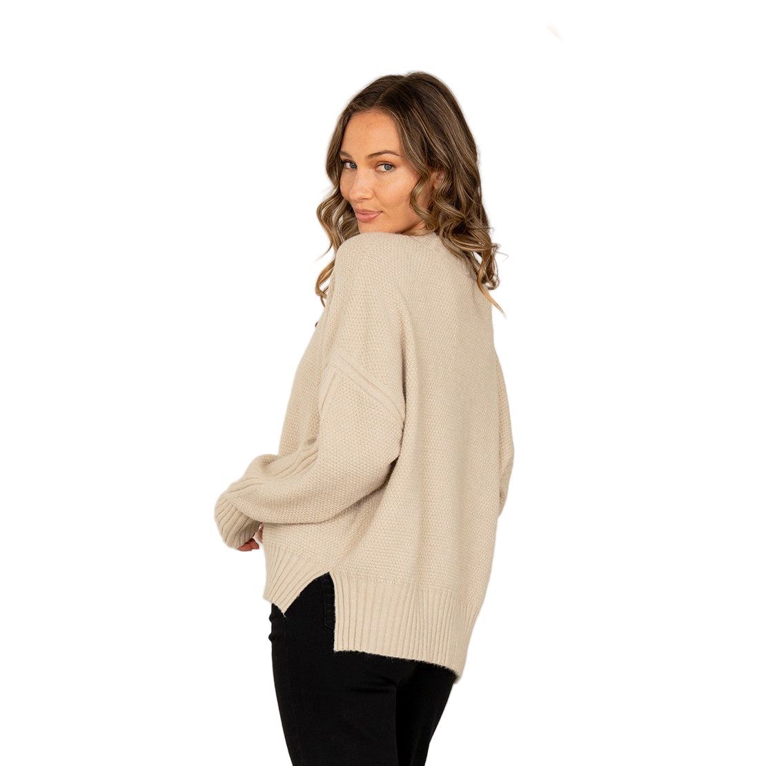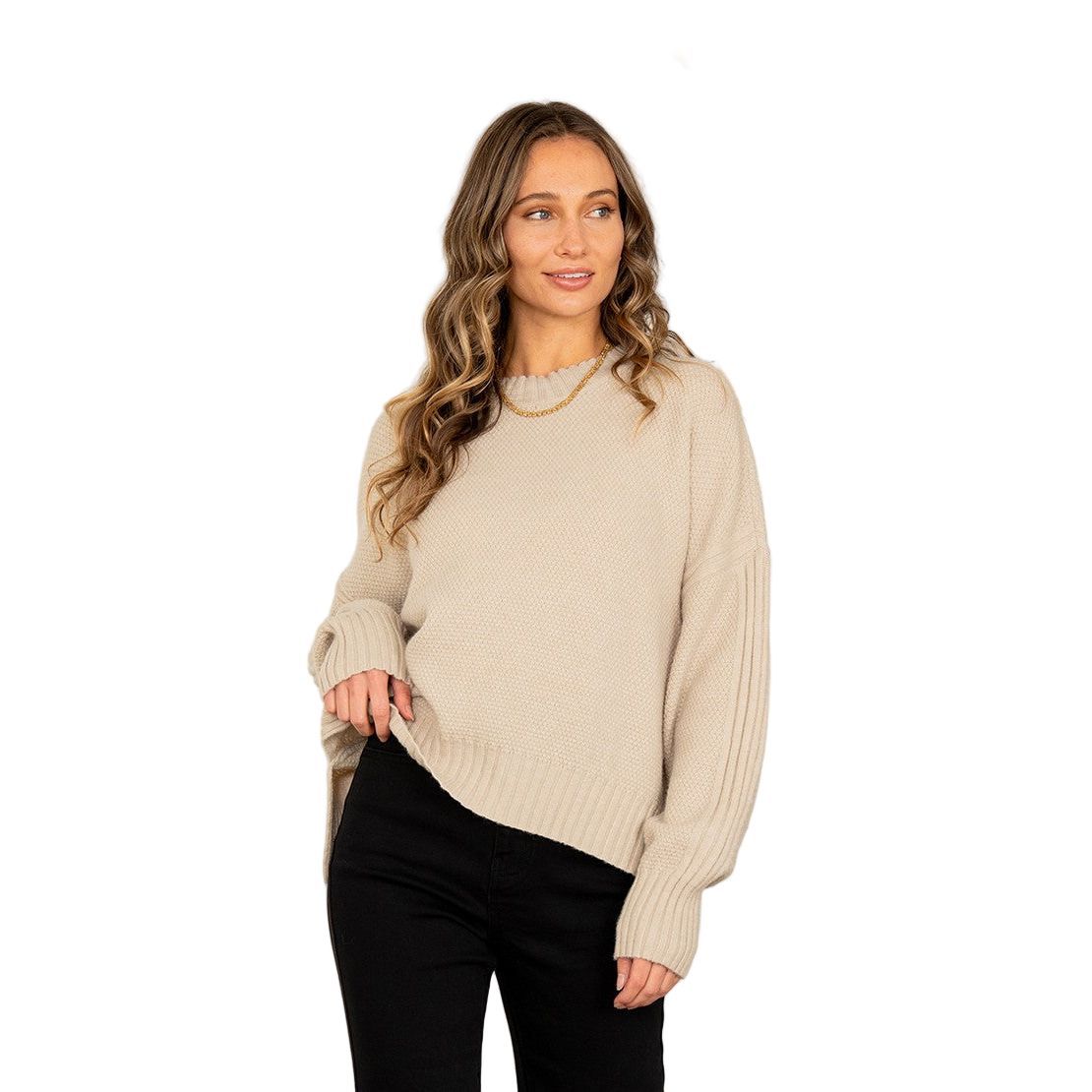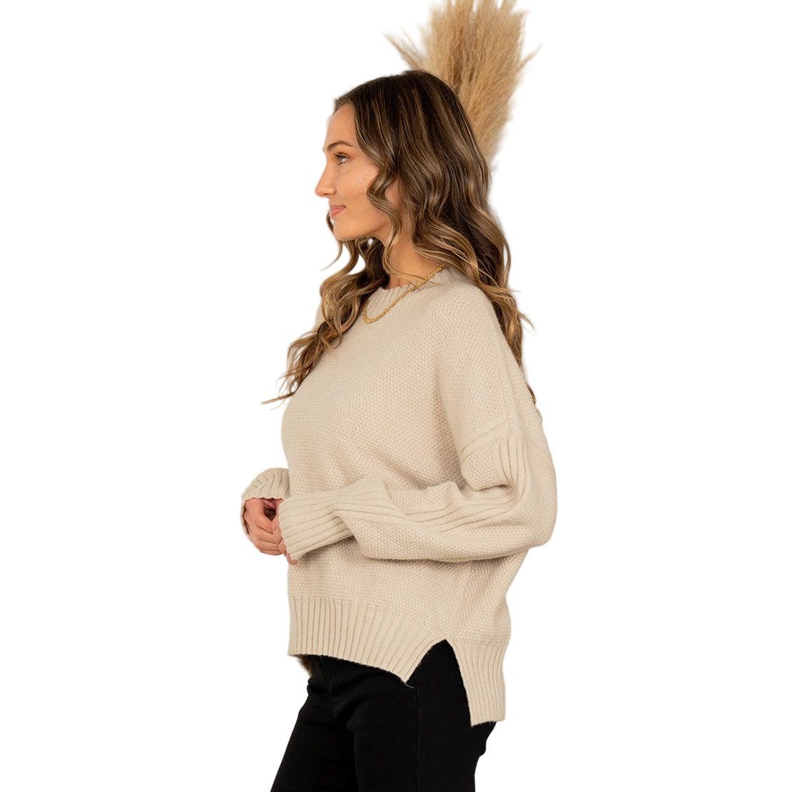 This cozy knit sweater features a textured waffle knit body with ribbed detailing on the sleeves and hem. Designed with a relaxed fit and drop shoulders for a laid-back, comfy look. The neutral taupe shade makes it a versatile layering piece for any season. * Style Number ET6240 * Relaxed Fit * Long Sleeves * Waffle Knit * Ribbed Hem * Drop Shoulder * Curvy Plus Size Available Model is 5' 8 and wears a size Small